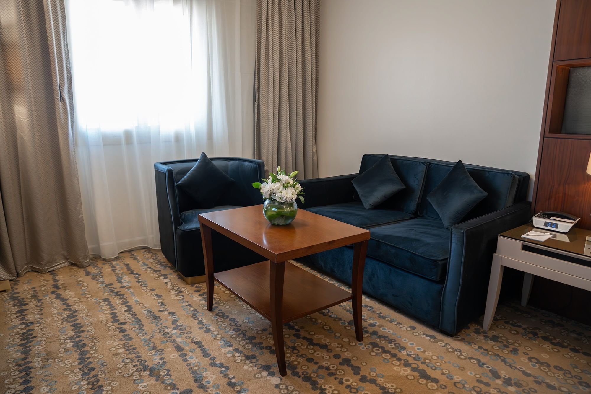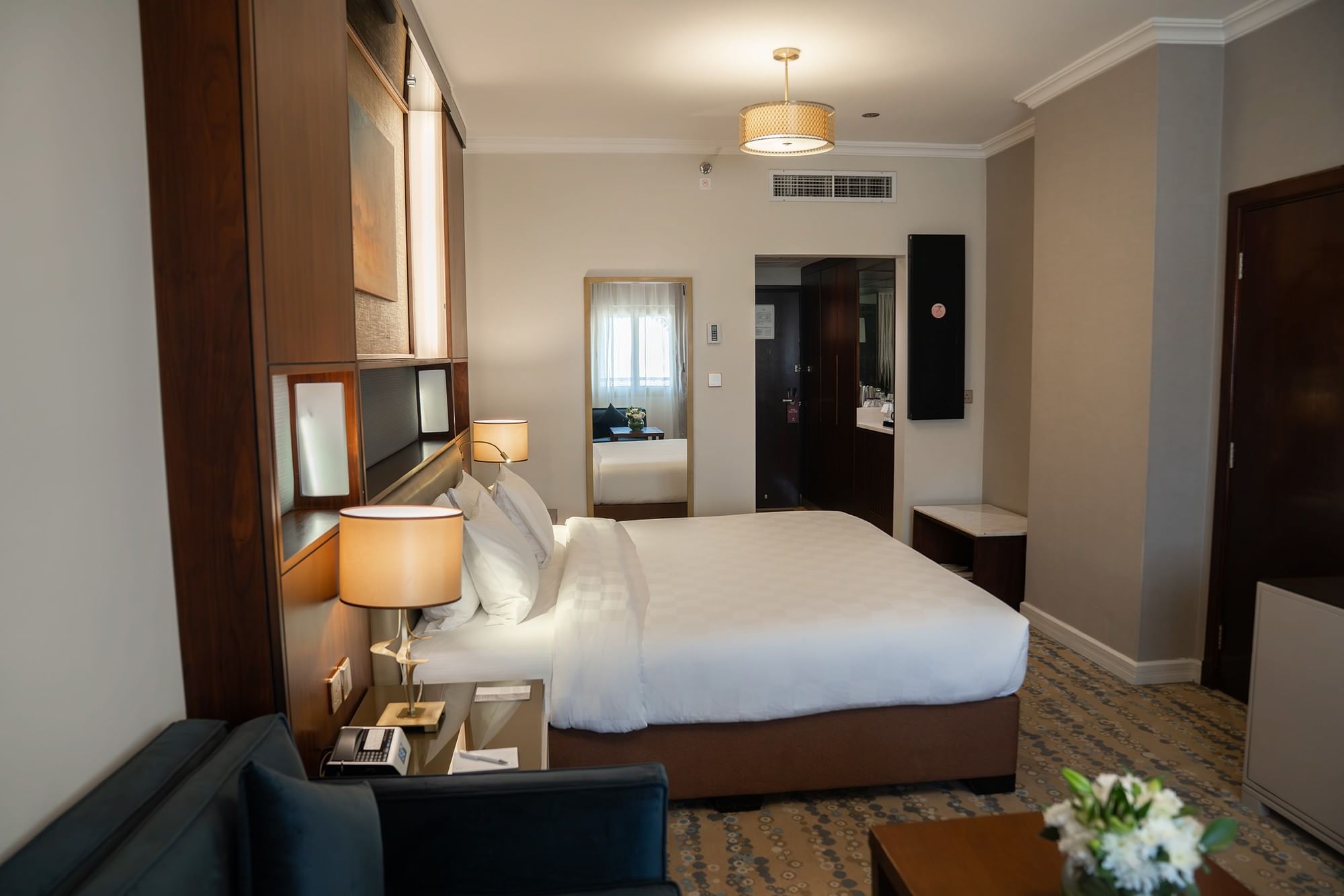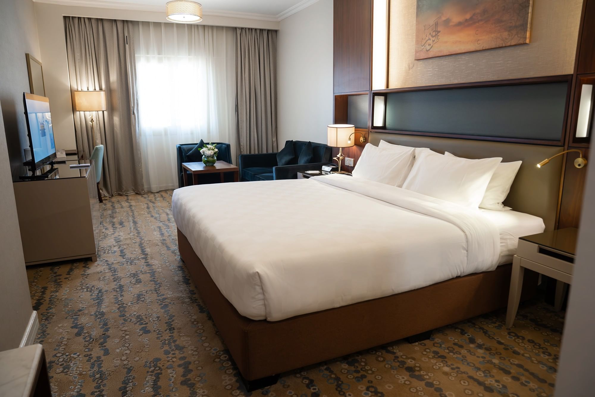 توفر غرفة "إكزيكتيف كينغ" ملاذًا واسعًا ومريحًا للمسافرين بغرض الترفيه الباحثين عن الراحة خلال إقامتهم في المدينة المنورة. وتضفي الألوان المحايدة الناعمة واللمسات الخشبية الدافئة والأعمال الفنية العصرية أجواءً هادئة. وتكتمل الغرفة بسرير كينغ ومنطقة جلوس مريحة ومساحة عمل مضاءة جيدًا. ويشتمل الحمام إما على مقصورة دش أو حوض استحمام ودش مدمجين. وتشمل المرافق تلفزيونًا مع قنوات فضائية وتكييف هواء بتحكم فردي وخزنة داخل الغرفة وميني بار ومرافق لإعداد الشاي والقهوة. يتمتع الضيوف أيضًا بإمكانية الدخول إلى الصالة التنفيذية في الطابق 14.