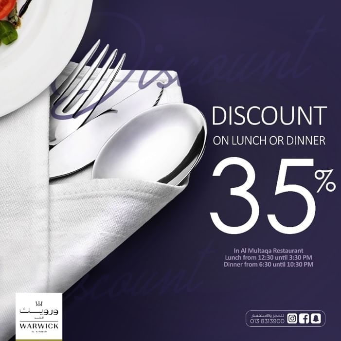 استمتع بعرضٍ مميّزٍ في فندق ورويك الخبر الذي يتميّز بحسم 35 في المئة للنزلاء على كافّة الوجبات داخل الفندق، وبتناول الطعام طوال النهار في مطعم الملتقى مقابل 400 ريال سعودي