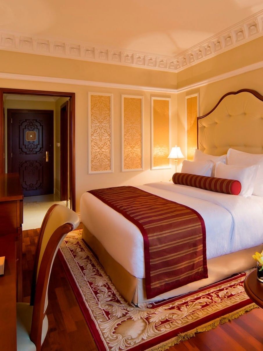 يمزج جناح ديلوكس بين السحر التقليدي والراحة العصرية، ويقدّم ديكورات راقية مع لمسات من الخشب الداكن، وسجاد عربي أحمر وأبيض دافئ، وجدران بألوان فاتحة. سرير كينغ، لوحة رأسية كبيرة وكرسي مبطن يعززون الأجواء، بينما تأطر الستائر بألوان الأرض المساحة بأناقة راقية.