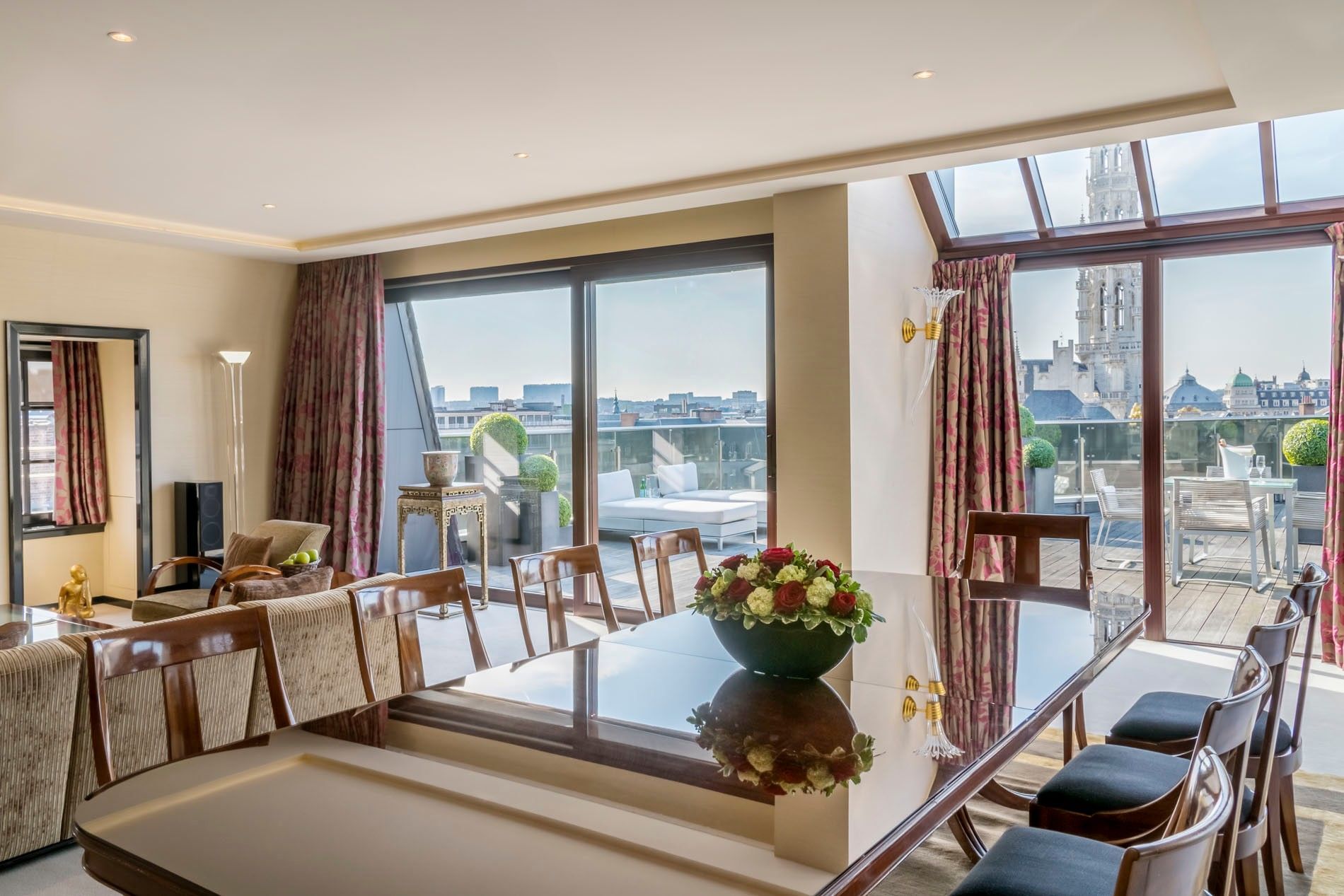 Avec ses 250 mètres carrés et sa terrasse supplémentaire de 150 mètres carrés, la suite Grand-Place est un penthouse offrant une vue panoramique. Accessible par un ascenseur privé, la suite comprend un salon, une salle à manger, une cuisine, un bar, un bureau, une chambre élégante et une salle de bains ornée de mosaïques de Murano, avec baignoire à remous et douche à l'italienne à effet pluie.