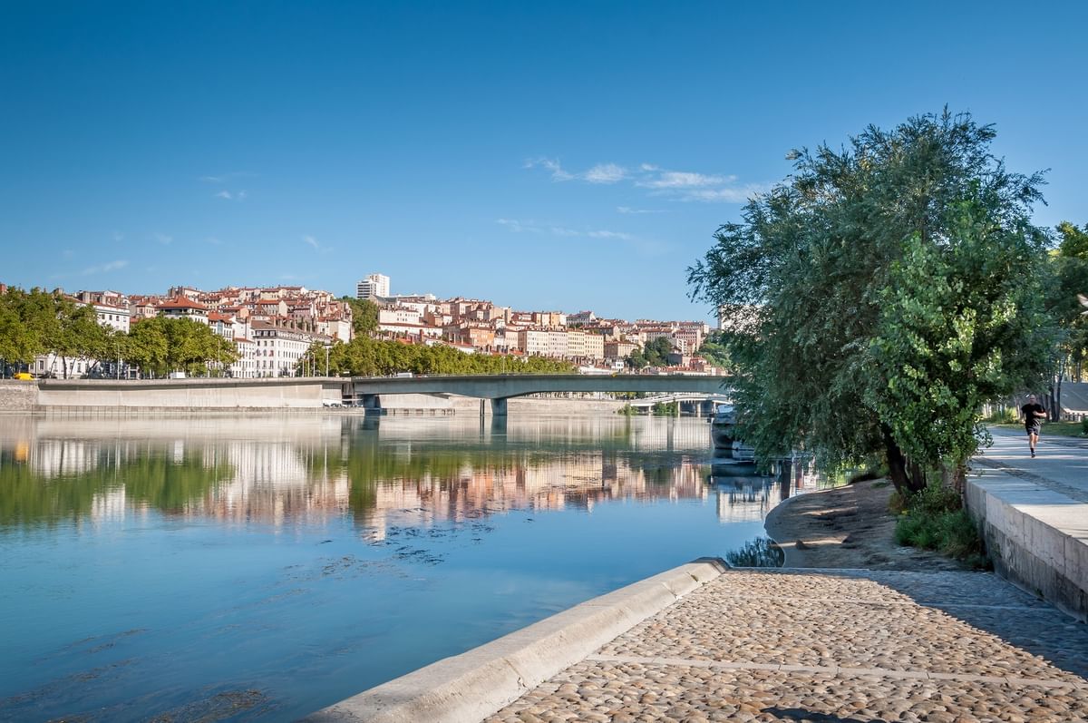 Poursuivez votre balade le long des berges du Rhône, où le rythme tranquille de la ville s'épanouit. Faites une pause au marché du Quai Saint-Antoine ou dans une pâtisserie voisine pour partager une tarte aux pralines, la pâtisserie emblématique de Lyon à base de pralines roses caramélisées — un moment simple et sucré à savourer ensemble.