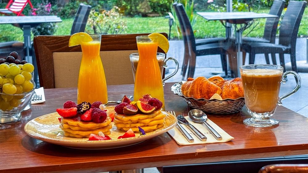 Laissez-vous tenter par une sélection raffinée de viennoiseries croustillantes, un assortiment de pains, de cakes maison, ainsi que des mets salés tels que œufs brouillés, bacon et saumon.