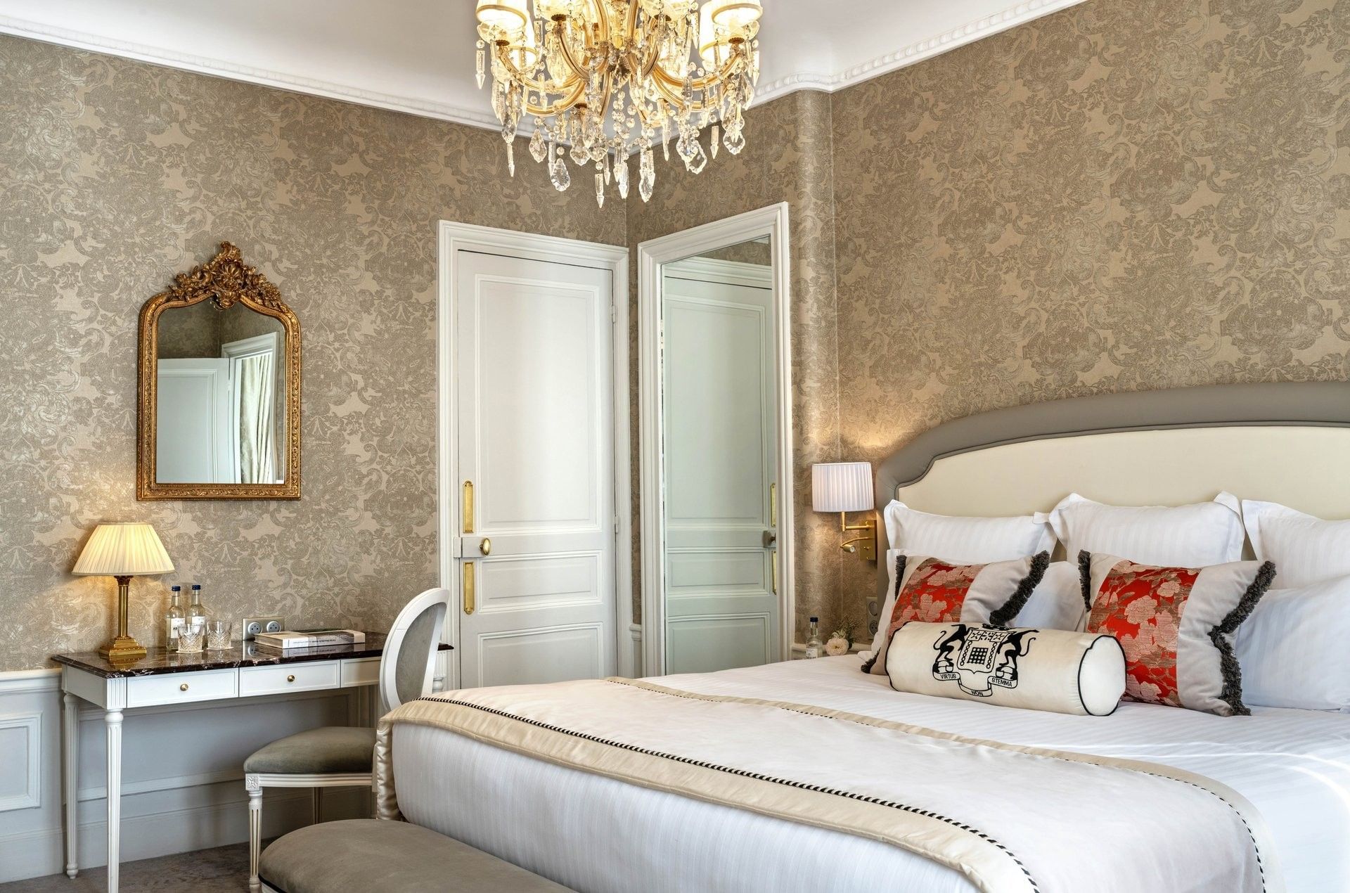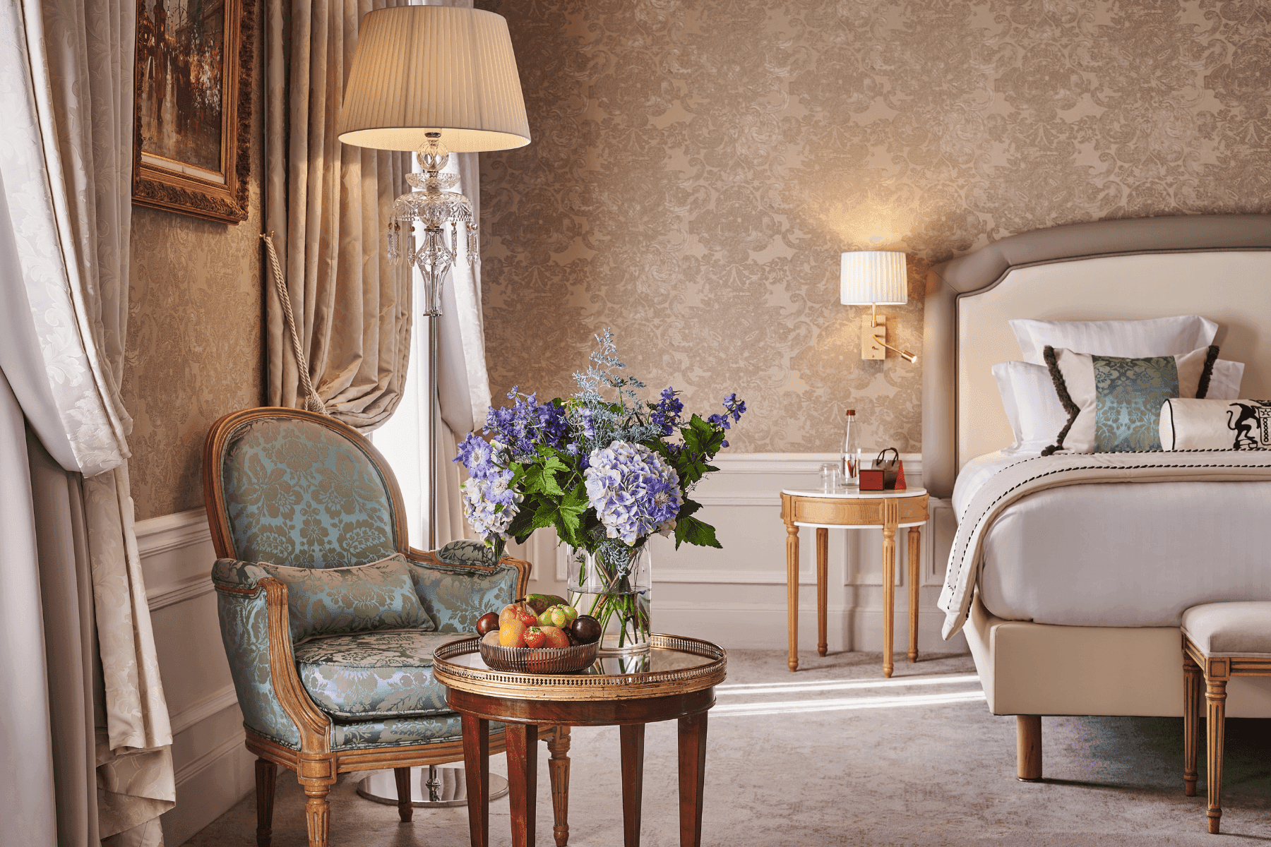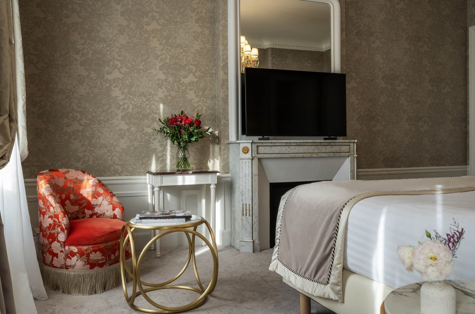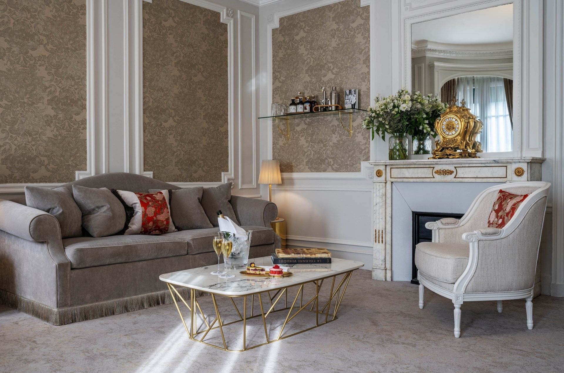 An exclusive and refined sanctuary, the Prestige Suite offers a spacious bedroom and separate living room adorned with luxurious fabrics, radiant chandeliers, and contemporary furnishings. Soft tones accented with hints of blue or red create a soothing atmosphere, while the elegantly designed bathroom blends historic charm with modern comfort. Natural light fills the suite, offering breathtaking views of Rue de la Paix and the iconic Vendôme Column.