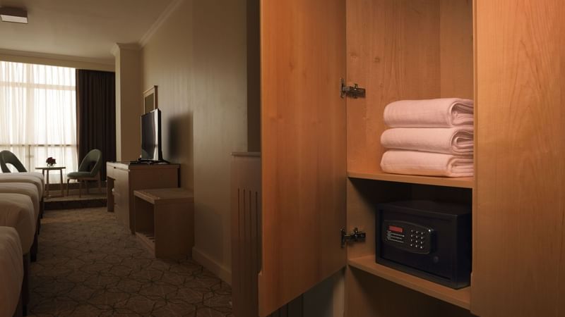 Accessible Rooms are designed to ensure ease and comfort for guests with reduced mobility. Featuring classic decor and clear pathways, these rooms include wheelchair-friendly layouts, low-placed safes, and accessible bathrooms with adapted showers and handrails. Standard amenities such as satellite TV, minibar, and tea and coffee facilities are also included.