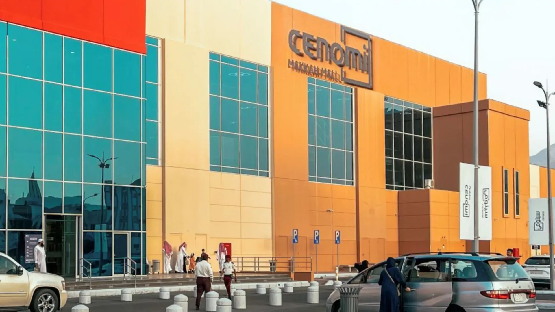Exterior view of the Cenomi Makkah Mall building with shoppers and parked cars near Saja by Warwick Makkah