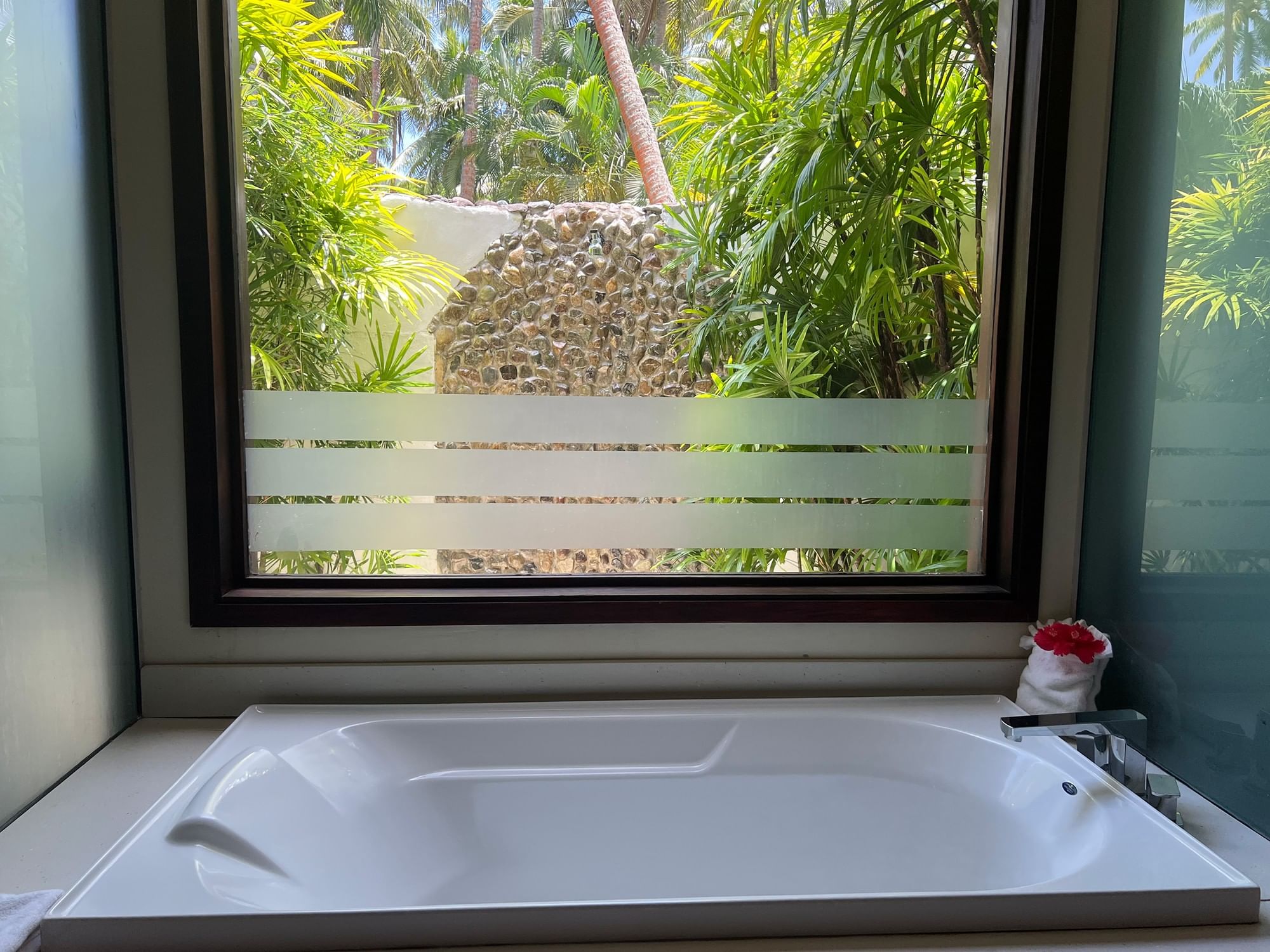 Inside, the villa blends understated elegance with island charm, featuring dark wood finishes, soft neutral tones, and subtle tropical accents. Comfort is thoughtfully considered with air conditioning, a ceiling fan, mini refrigerator, and coffee and tea facilities, while the spacious bathroom—complete with both an indoor bath and outdoor shower—adds a touch of indulgence. Perfect for couples seeking privacy and tranquility, this beachfront escape invites you to slow down and savor every moment.