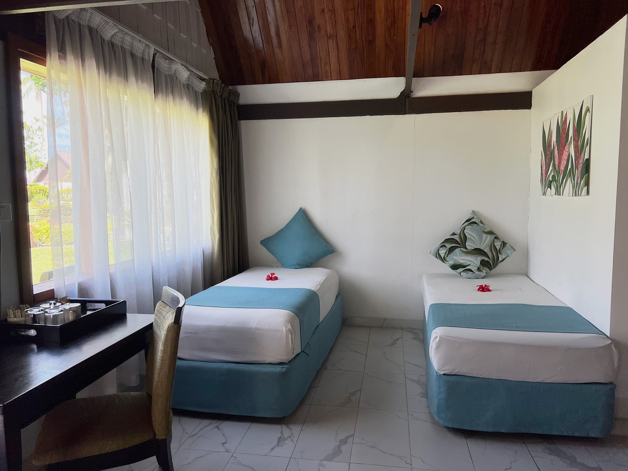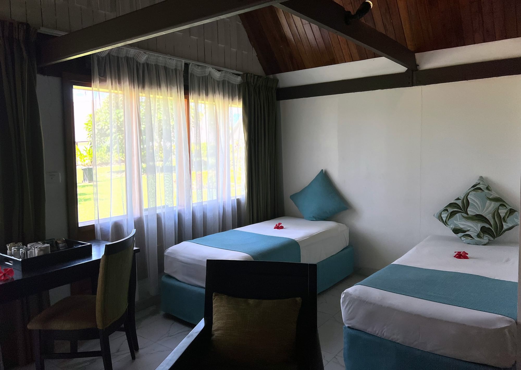 Nestled among lush tropical greenery with a mountain backdrop, this garden view bure offers a peaceful and private retreat surrounded by nature. Designed with soft island tones and natural textures, the villa features one double bed and two single beds, making it a perfect choice for couples, small families, or friends traveling together.