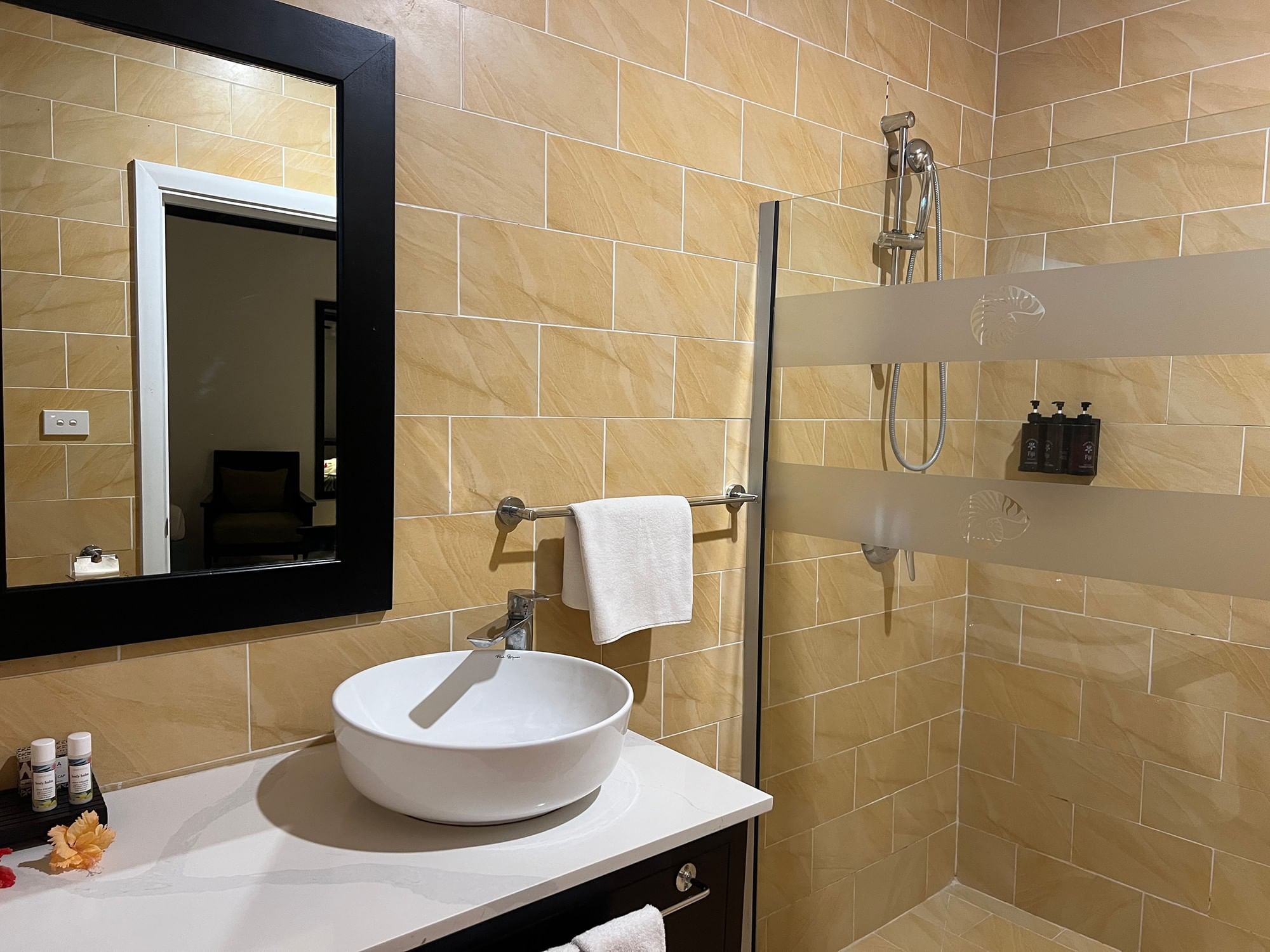 Designed with a relaxed tropical aesthetic, the interiors feature warm tones inspired by island reds and lush greens, creating a welcoming and tranquil atmosphere. The villa is thoughtfully equipped with modern comforts, including a spacious bathroom with both shower and bath, plush bathrobes, a hairdryer, ceiling fan, coffee and tea-making facilities, a mini refrigerator, and convenient room service.
