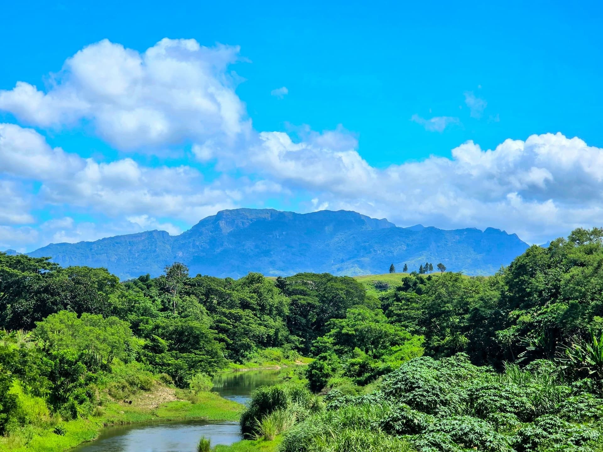 Lush green valley with a river and mountains in the Garden of the Sleeping Giant near TokaToka Resort Nadi Fiji Plus Icon