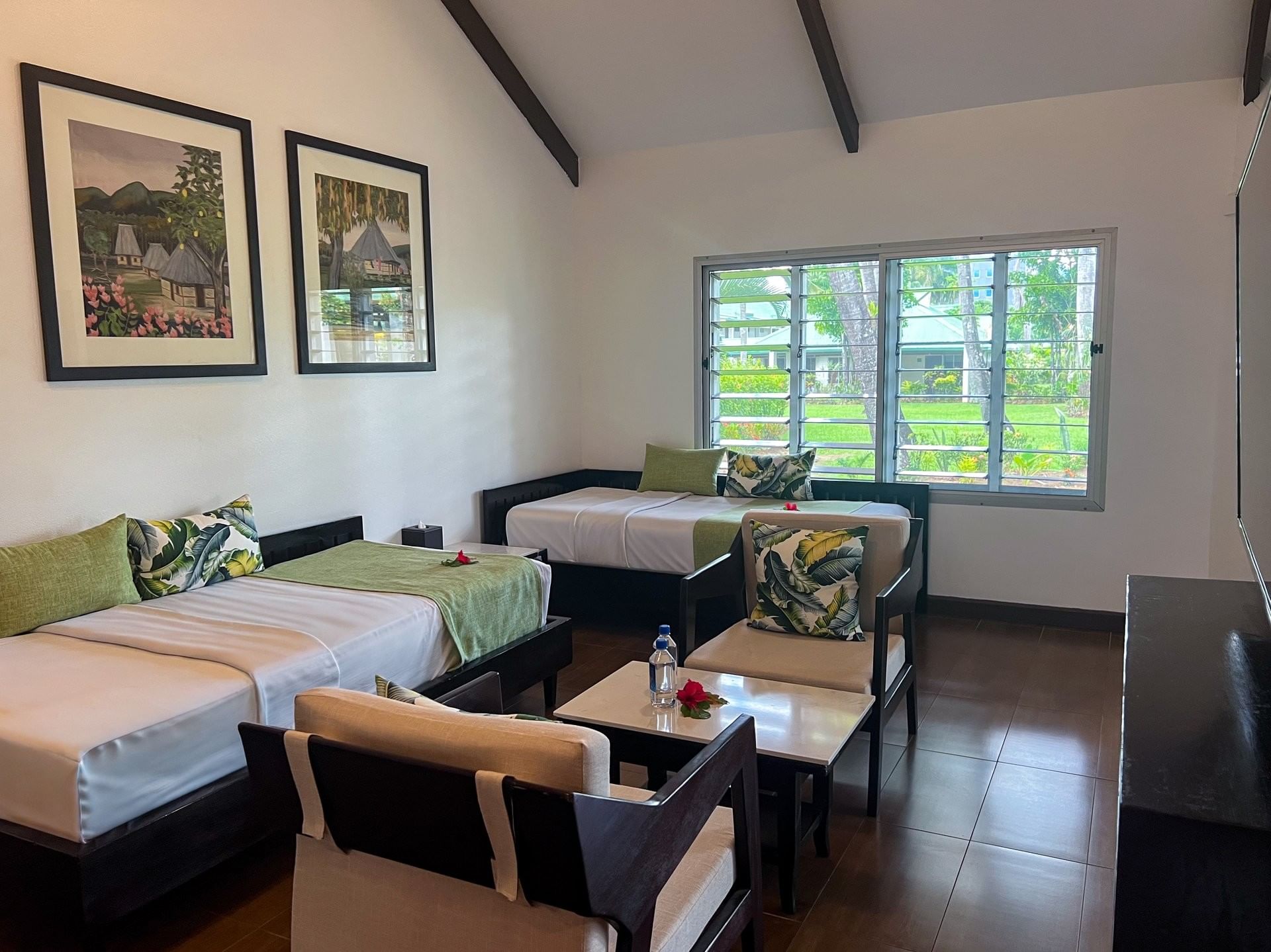 Set in a serene garden setting, the One Bedroom Villas combine space and privacy with contemporary island design. Each villa features a queen-sized bed in the master bedroom, a separate lounge with two single sofa beds, a convenient kitchenette, and dining area, and thoughtful touches throughout for a tranquil stay near Nadi Airport.