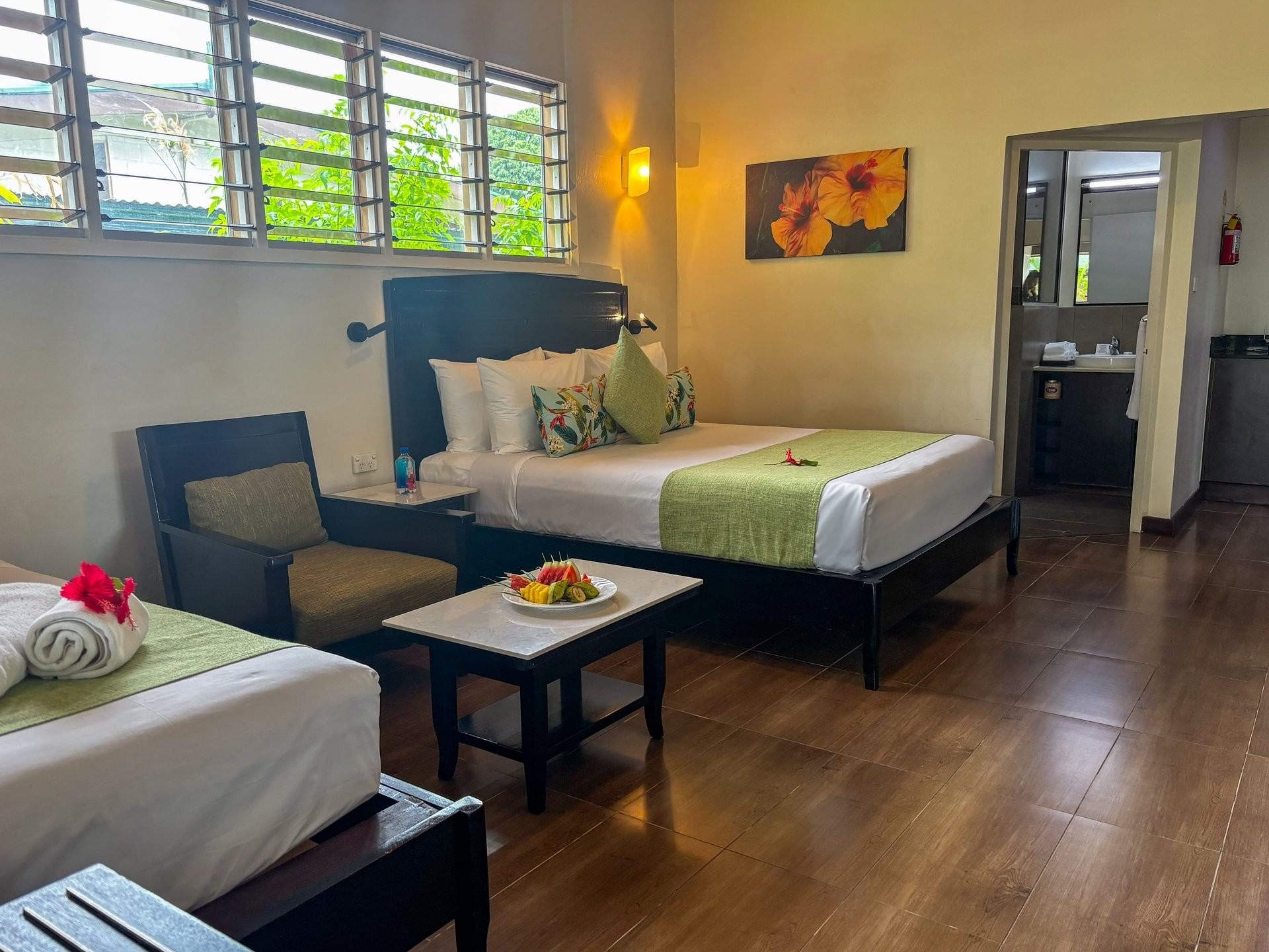 Just steps from Nadi International Airport, the Studio Villas offer a peaceful retreat with bright, tropical interiors and views of lush gardens. Each open-plan villa includes either a queen bed or a queen and single bed, with modern amenities such as air conditioning, mini fridge, satellite TV, tea and coffee facilities, and premium bath products.
