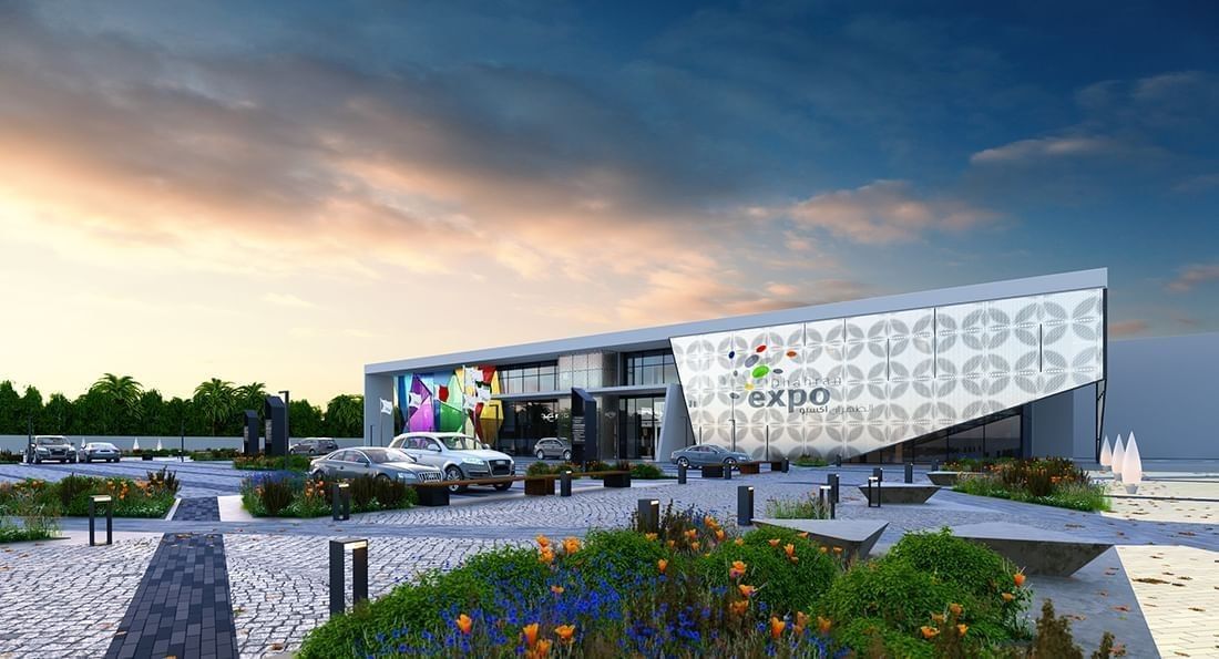 Dhahran Expo by parked cars under a soft sunset sky with vibrant banners near Warwick Al Khobar Plus Icon