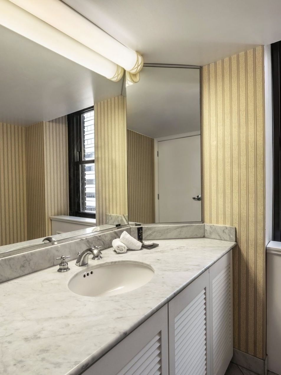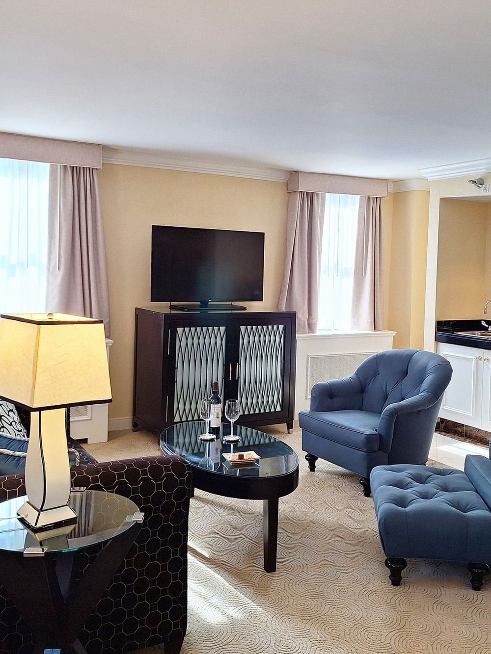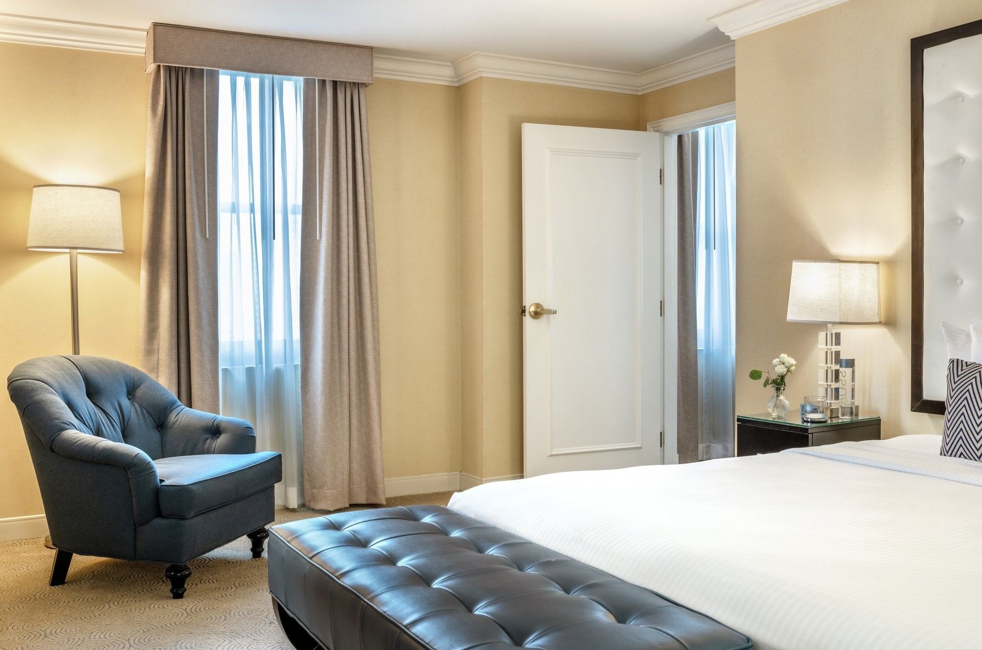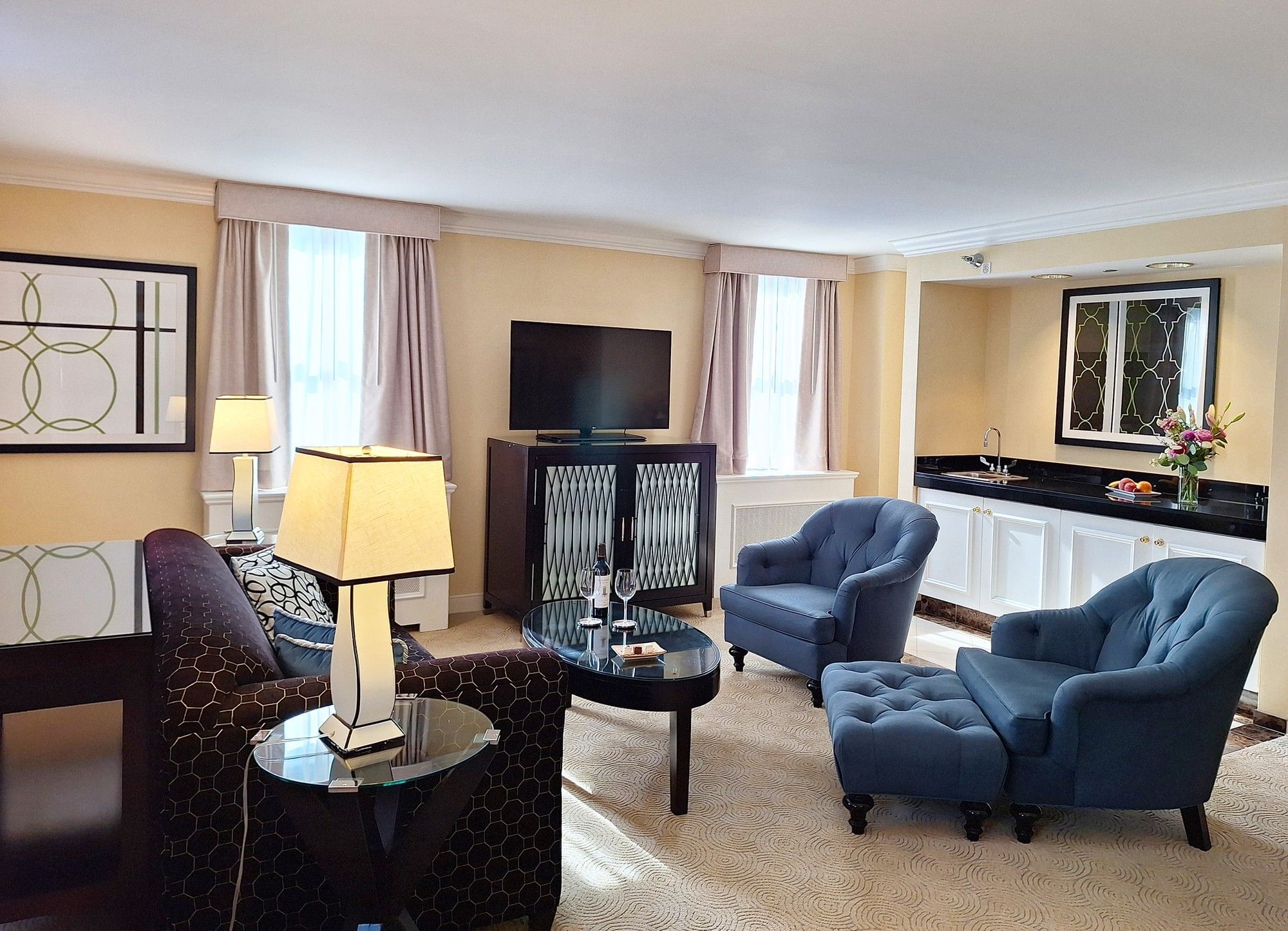 At approximately 65 m² (700 ft²), the Specialty Suite offers exceptional comfort and classic style with a separate bedroom and living area, marble bathroom, and flat-screen TVs in both rooms. Timeless furnishings and thoughtful amenities such as a microwave, individually controlled thermostat, and high-speed Wi-Fi complete this elevated downtown Chicago retreat.