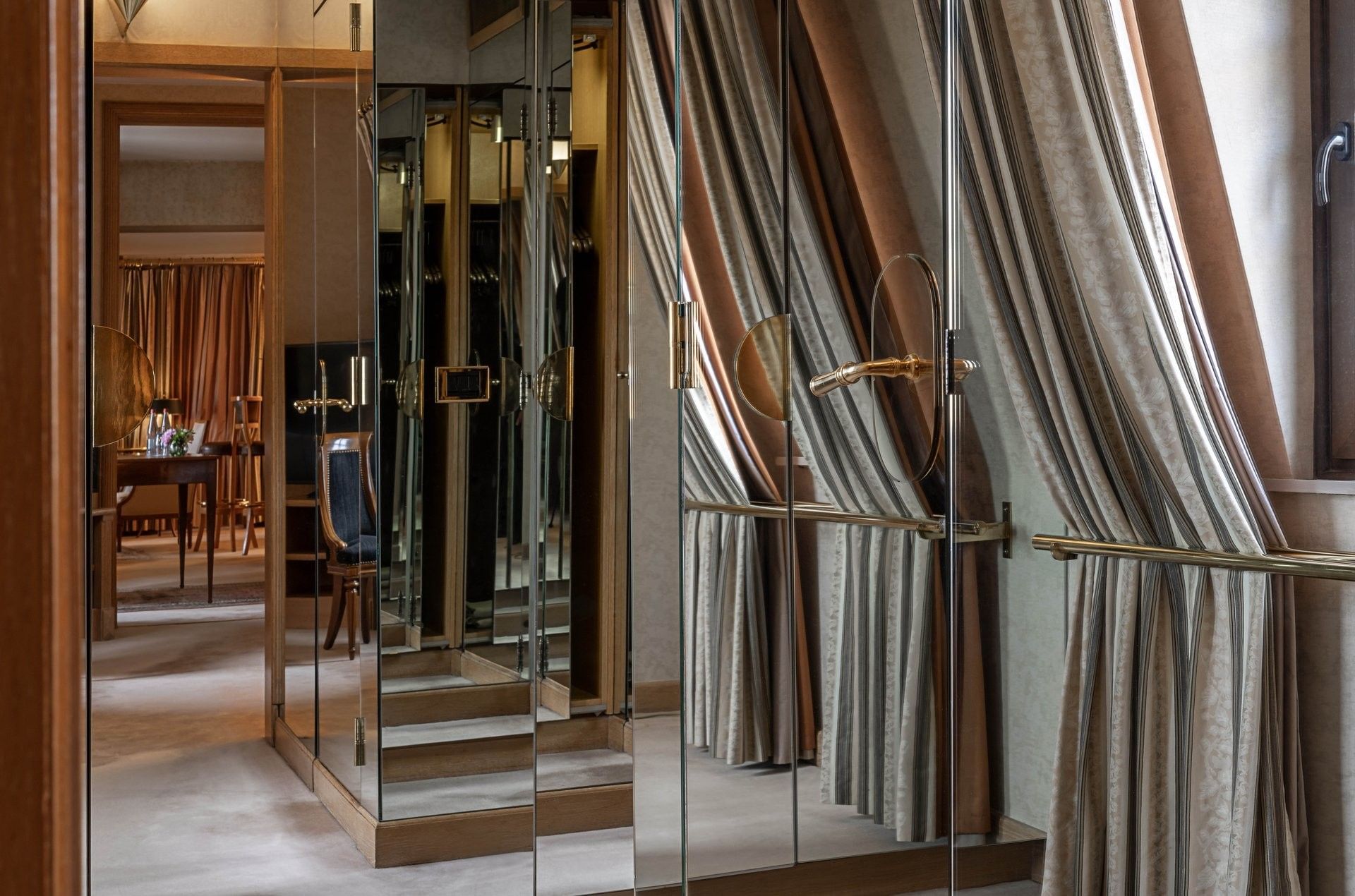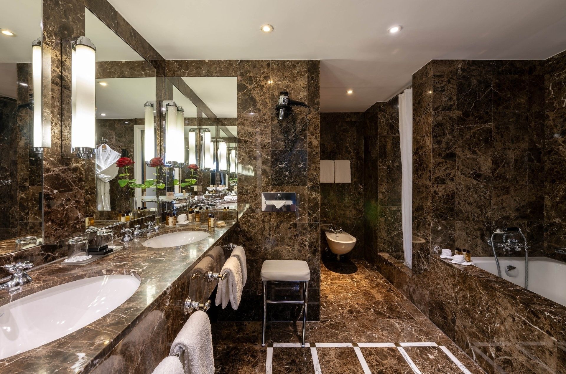 Offering 100 square metres of refined space, the Royal Suite includes a dining room, private bar, dressing room, and elegant marble bathroom with dual sinks, a hot tub, and two-person sauna. Classical furnishings and artwork create an elevated, regal ambience.