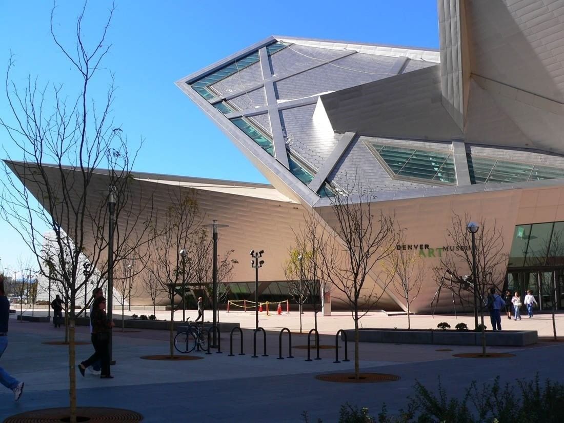 Denver Art Museum exterior with geometric panels by bare trees under a blue sky near Warwick Denver Plus Icon