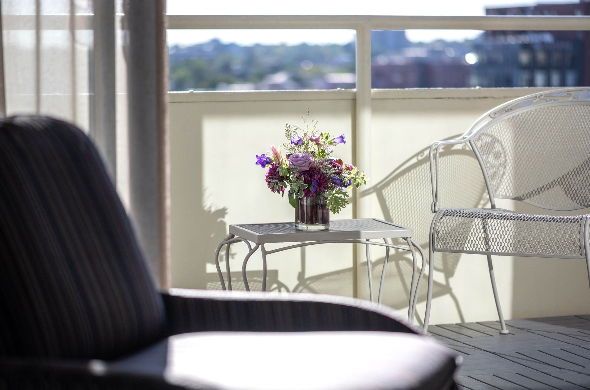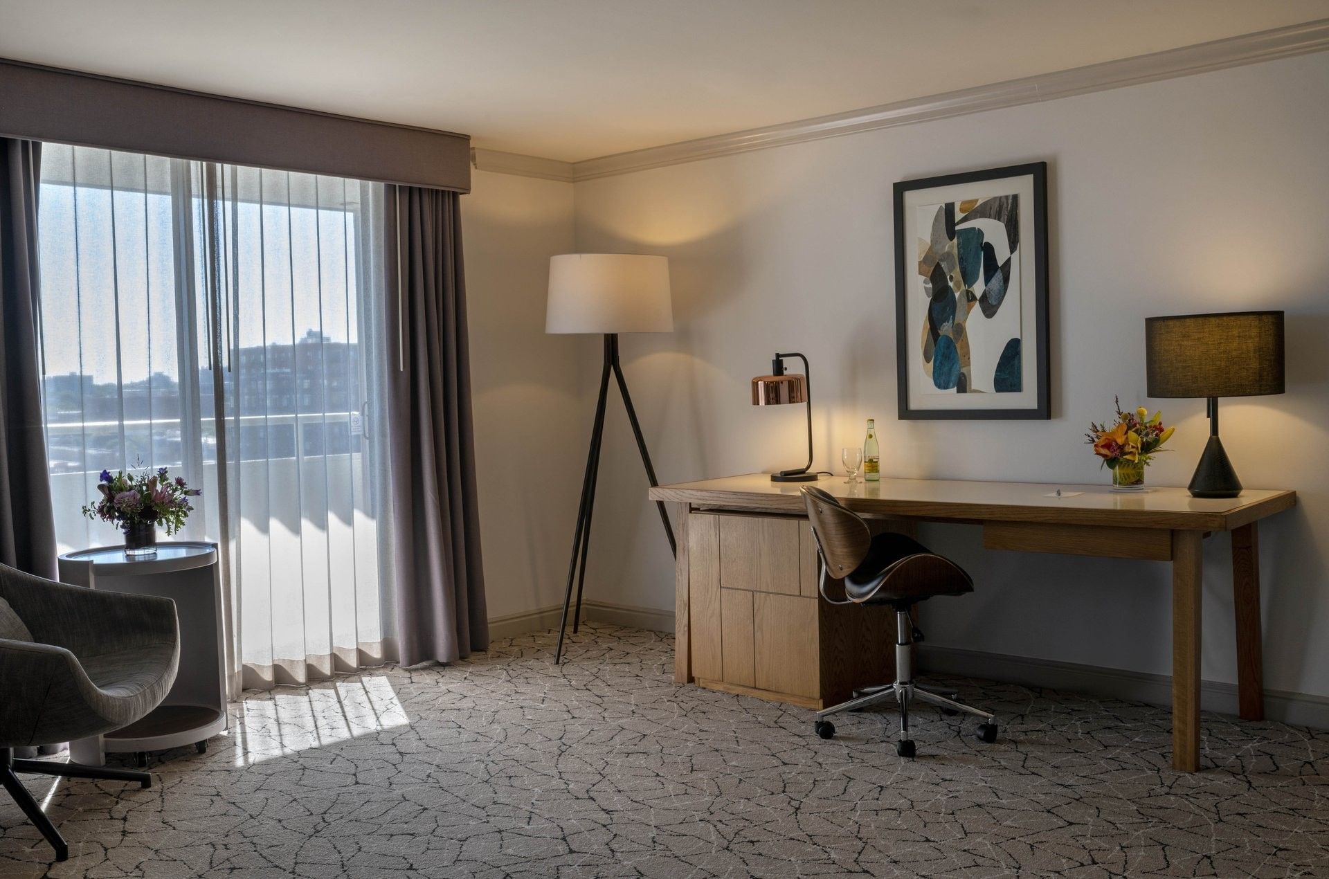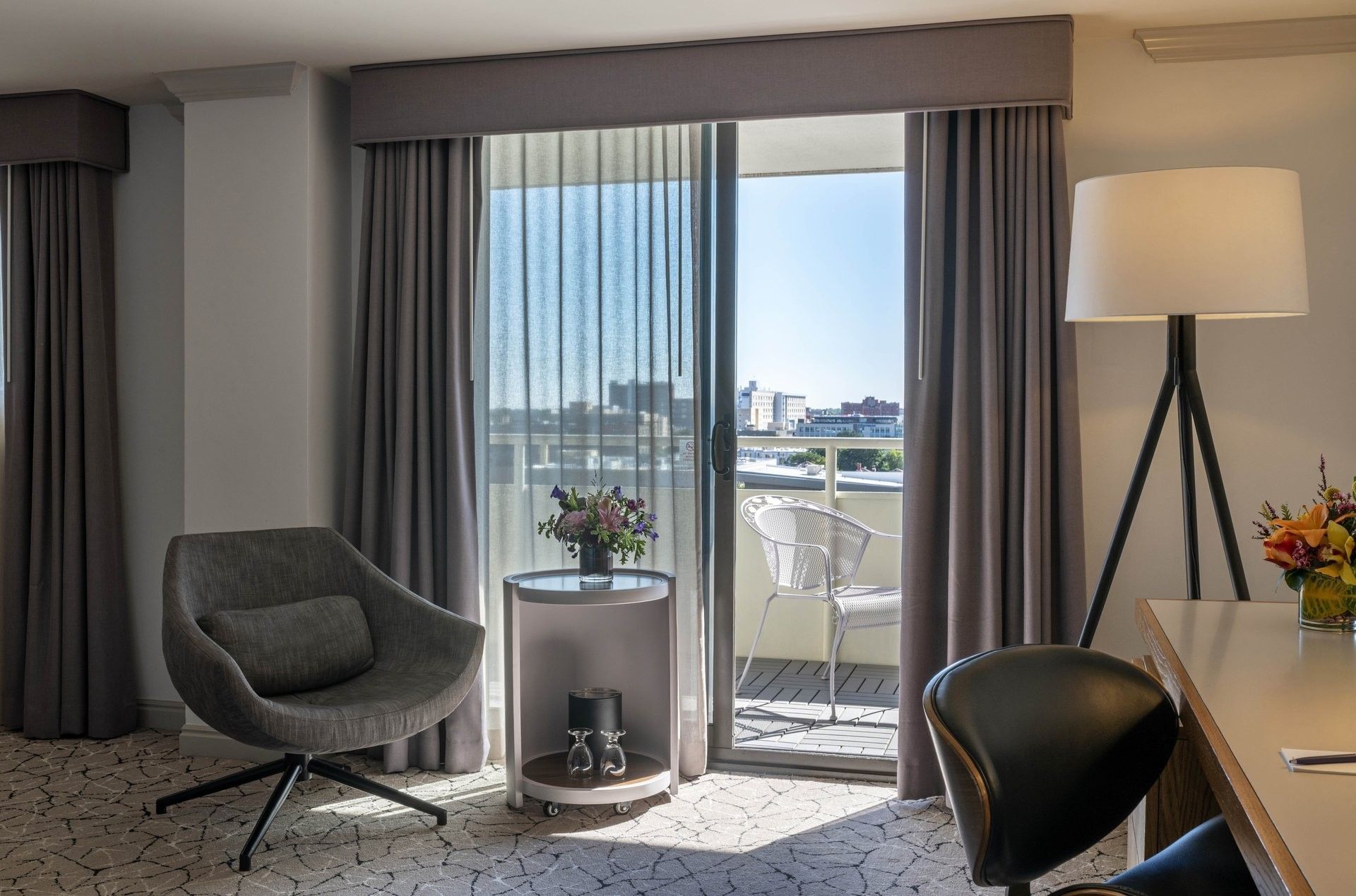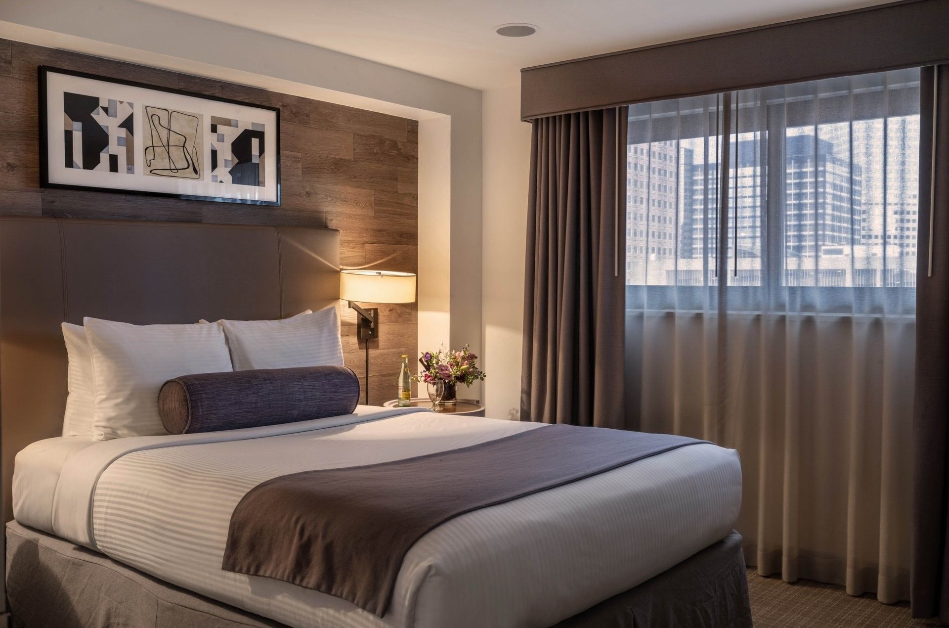 The 600-square-foot Executive Junior Suites evoke both luxury and comfort, blending residence-style ease with Warwick's boutique elegance. Each suite features a separate living area with a queen-sized sleeper sofa, a walk-in closet, wet bar, and chic furnishings set in a calming palette of grey, white, and purple.