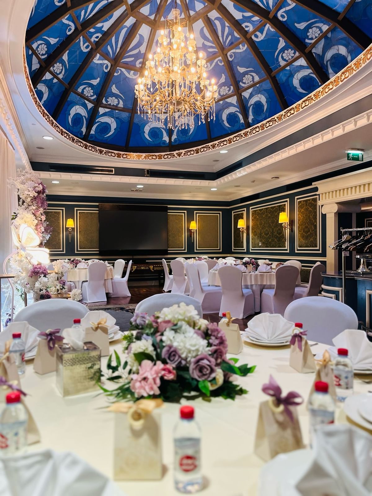 The Blue Room accommodates up to 50 guests in both banquet and theatre-style setups, combining a warm ambiance with elegant décor.