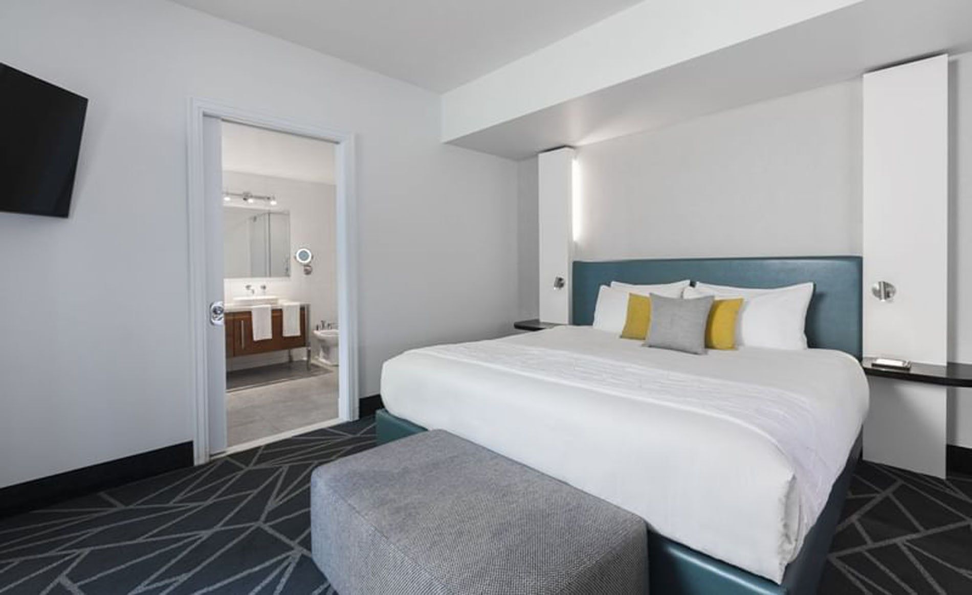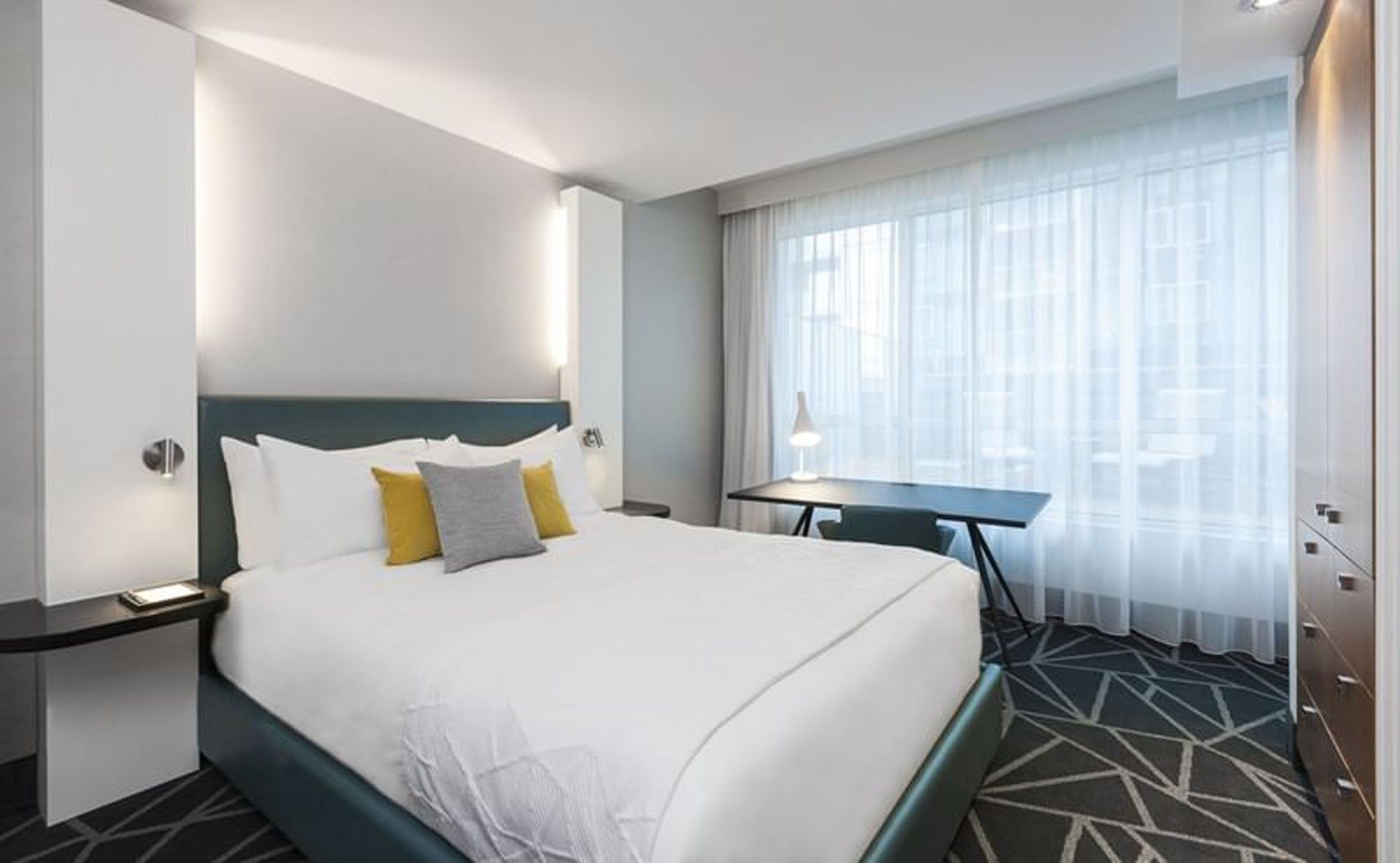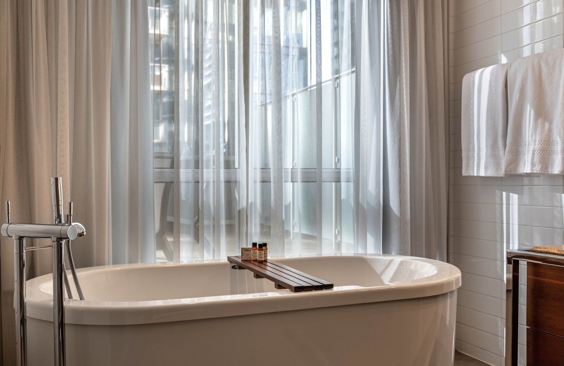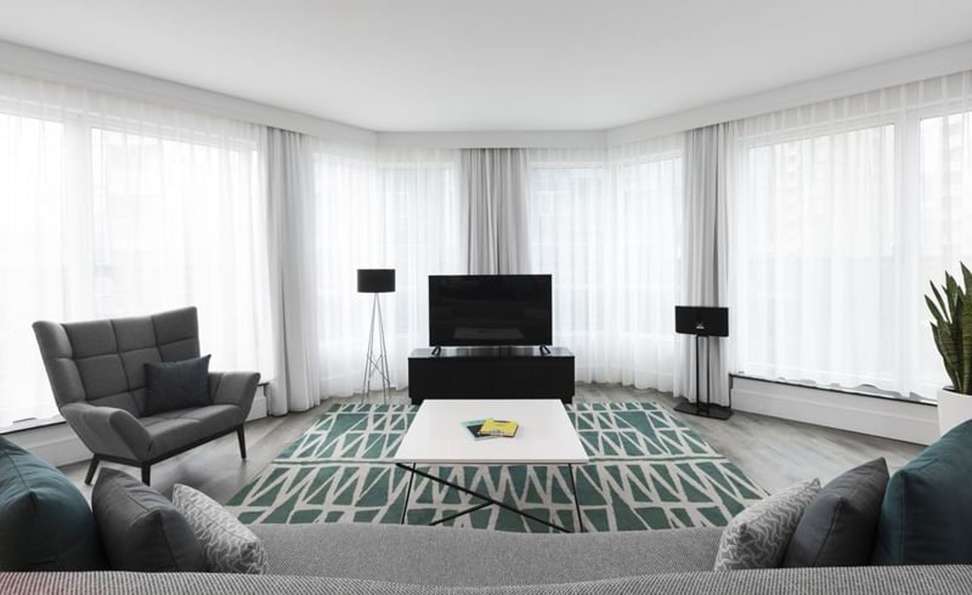 Perched above Rue De la Montagne, the Penthouse De la Montagne offers sweeping views of Mount-Royal through dramatic bay windows and a panoramic private terrace. Inside, a spacious living area is bathed in natural light and features a cozy fireplace, ideal for relaxing or entertaining. Two private bedrooms, each with their own ensuite bath, are separated by a generously sized lounge. With a fully equipped kitchenette and elegant furnishings throughout, this suite blends penthouse prestige with residential comfort.