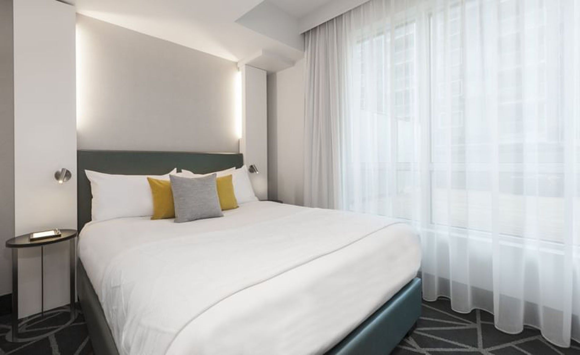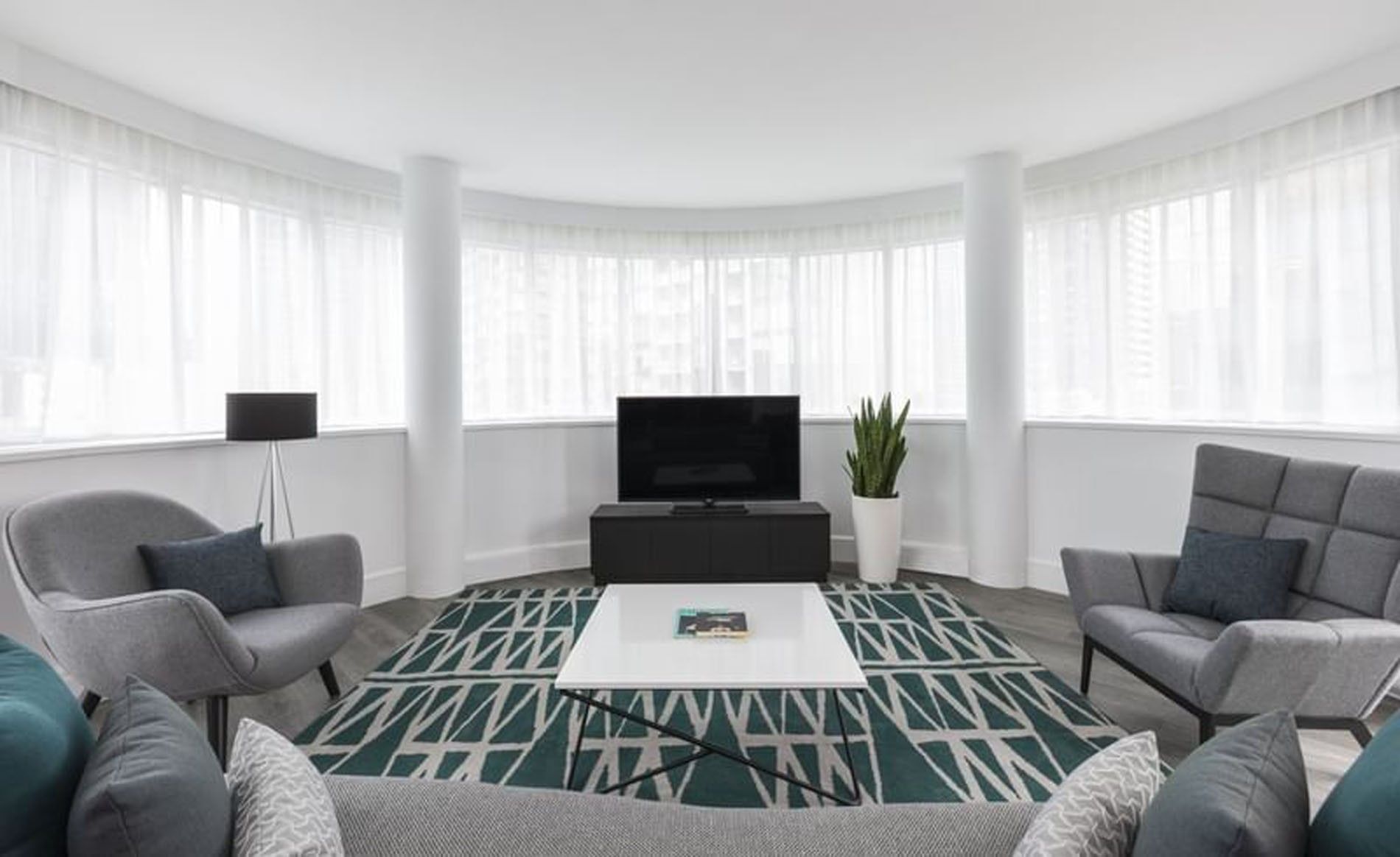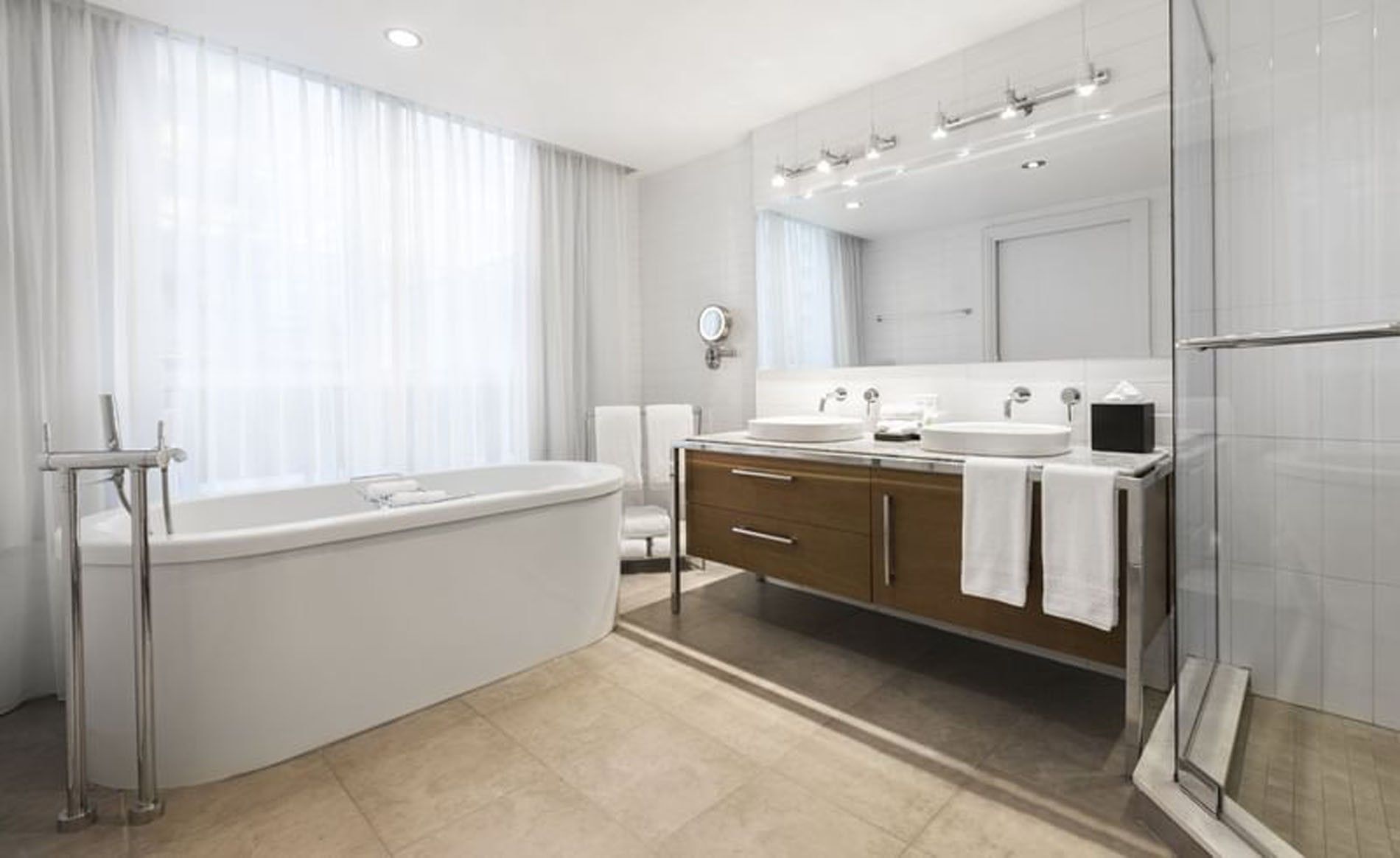 Framed by signature rotunda bay windows, the Penthouse Drummond invites guests to take in sweeping views of downtown Montreal. This luminous suite features two private terraces with view of Mount Royal and René-Levesque Boulevard, offering generous outdoor space. Inside, a large living room with dining area, cozy fireplace, and fully equipped kitchenette sets the tone for stylish city living. Two private bedrooms, each with their own ensuite bathroom, complete this refined retreat.