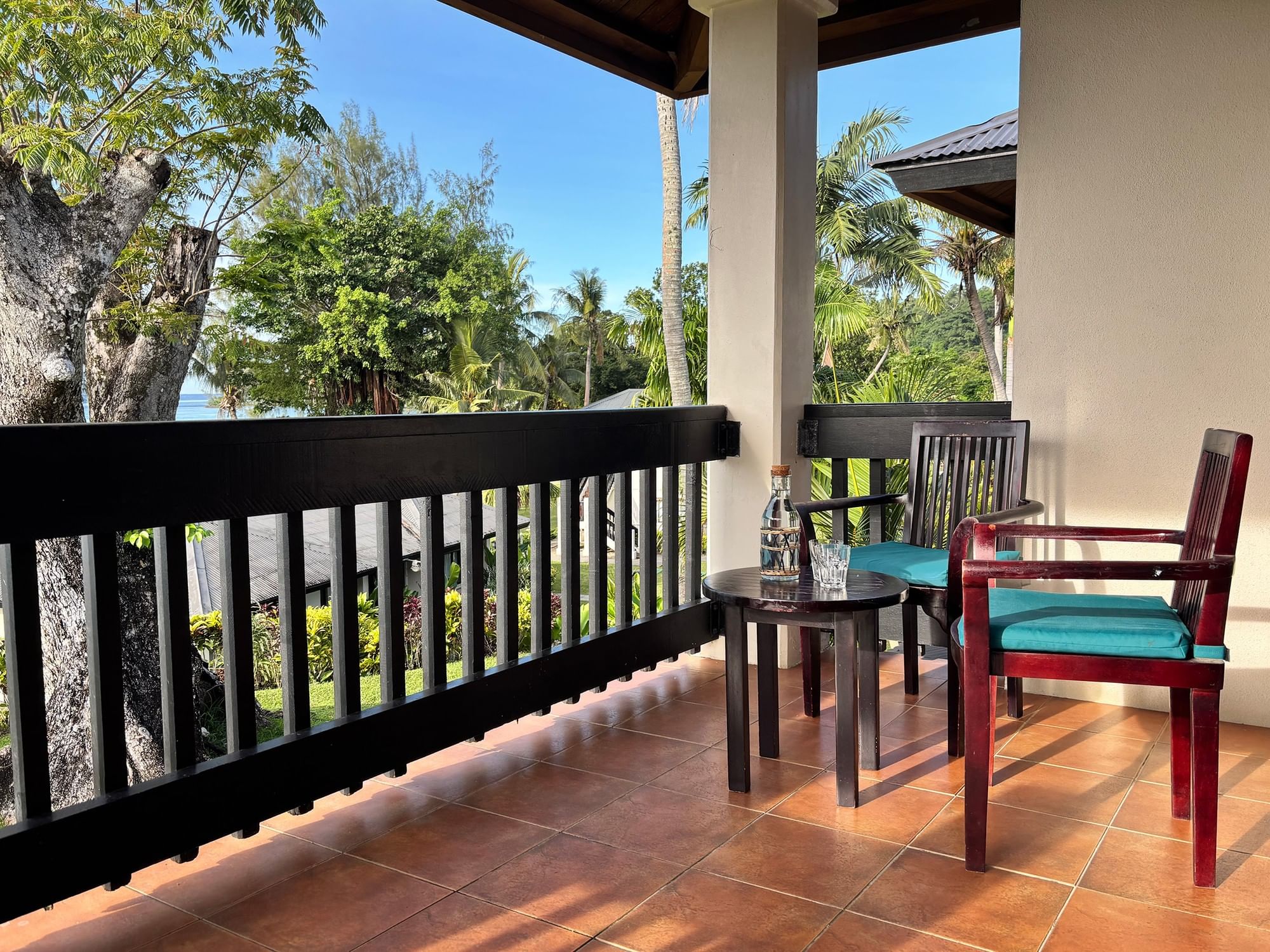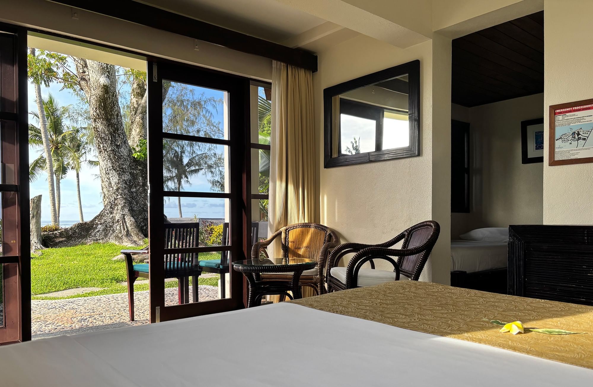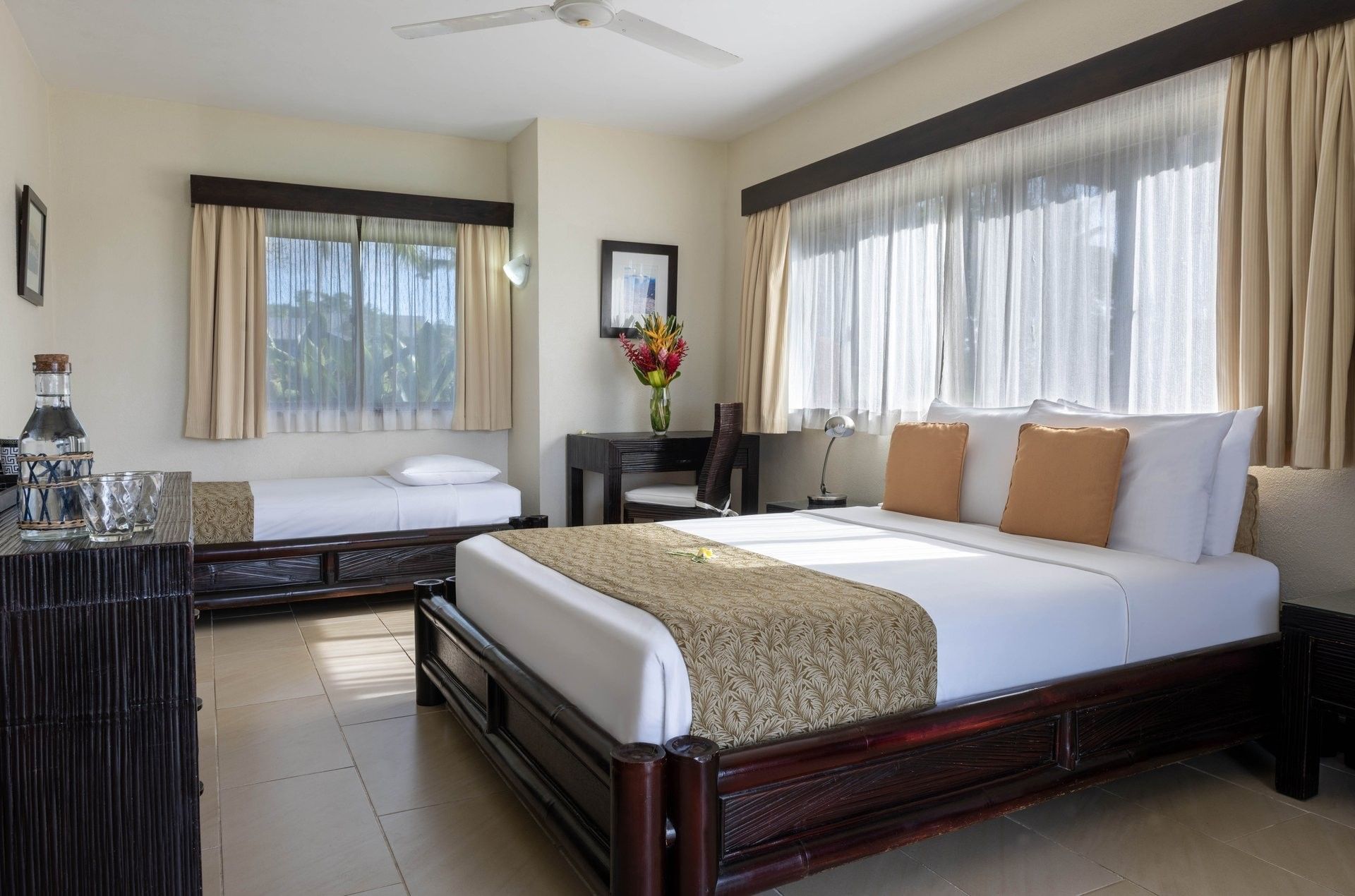 The 34 m² Lagoon View Room combines comfort and style with scenic views of Erakor Lagoon. Featuring a warm beige palette, dark mahogany furnishings, and a private balcony or patio, this room invites relaxation in a tropical setting. Suitable for up to two adults and two children or three adults, bedding options include one queen bed, two queen beds, or one queen and two single beds. Interconnecting rooms are available.
