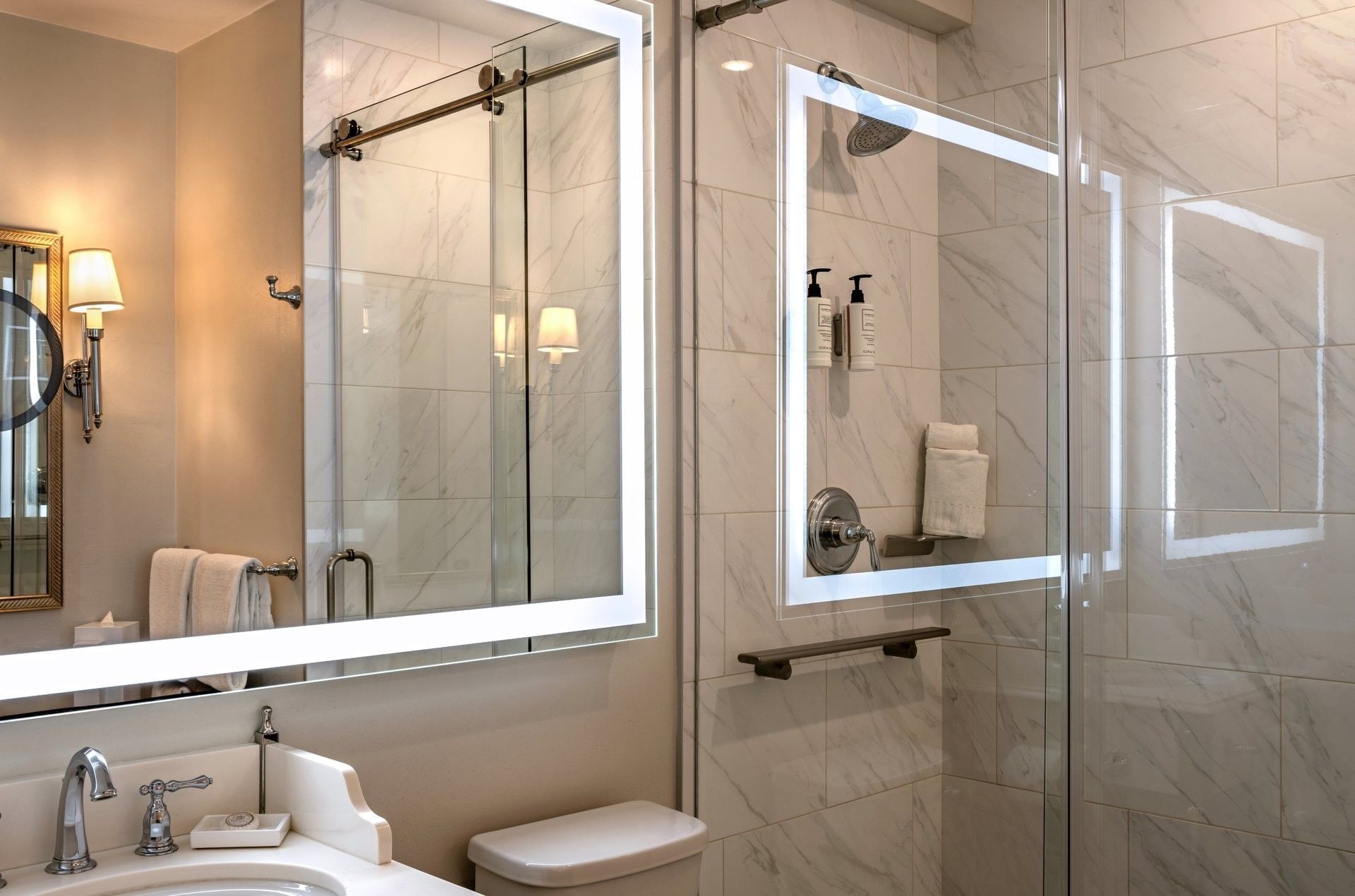 Classic sophistication defines this 350-square-foot retreat, where abundant natural light enhances the sense of space and comfort. Two double beds, dressed in Italian Fili D’Oro duvets and 300-thread-count linens, offer a luxurious and inviting setting. The room is styled in a warm bronze palette, complemented by elegant dark wood furnishings, plush upholstered seating, and French Empire–inspired nightstands in silver and glass, creating an atmosphere of understated luxury.