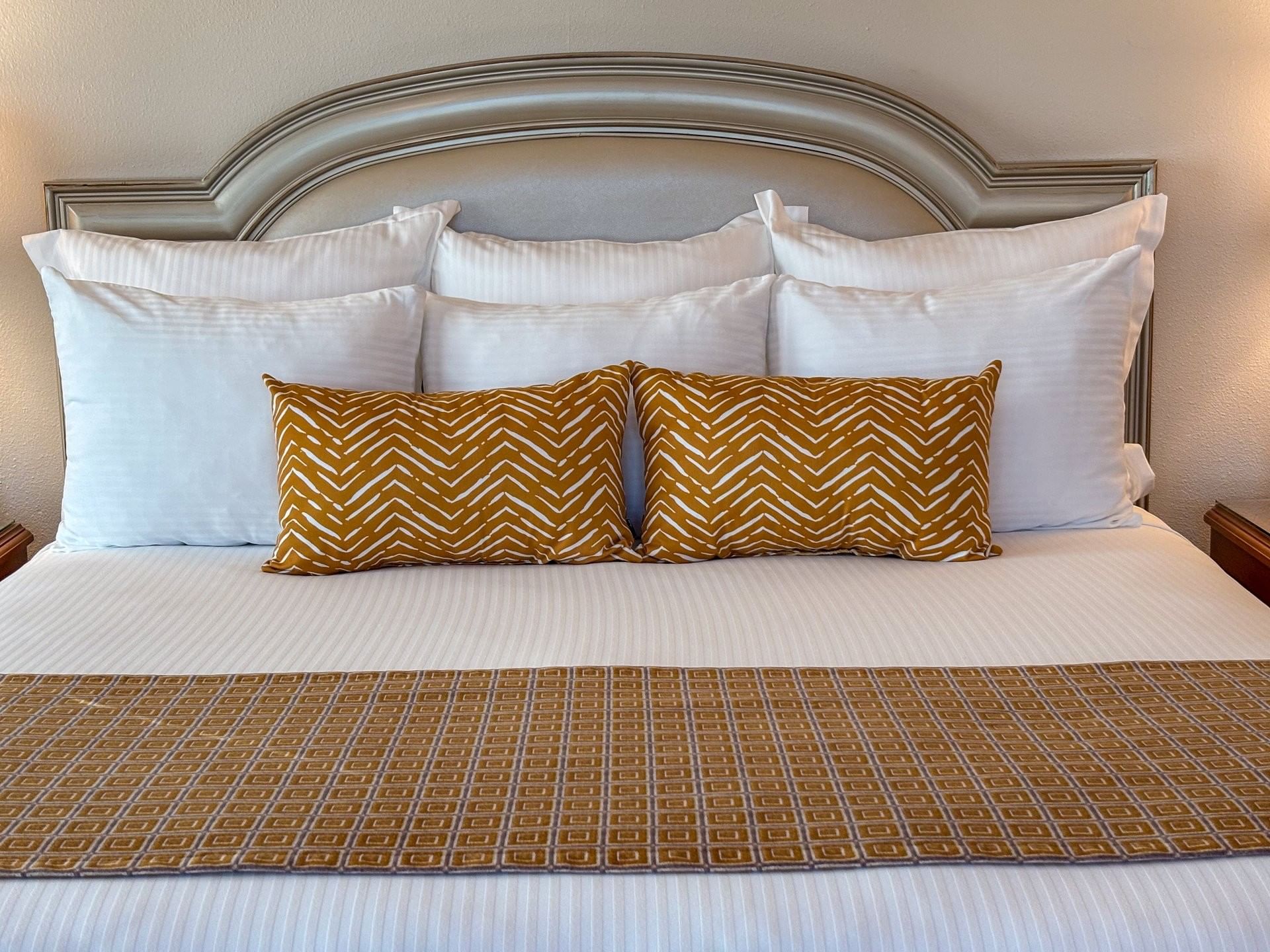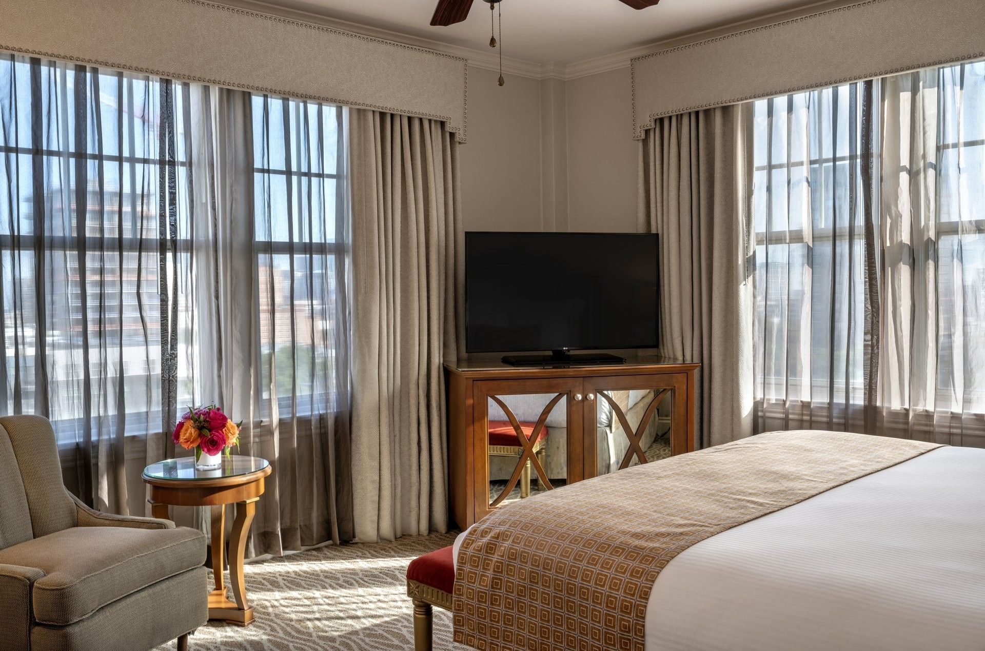 Blending classic elegance with modern sophistication, the Corner King offers a spacious, open layout enhanced by oversized windows on two sides, filling the room with natural light. A warm, refined rust-toned palette complements the striking canopy king bed, dressed in Italian Fili D’Oro duvets and 300-thread-count linens. A thoughtfully arranged sitting area, featuring a loveseat and an additional chair, completes the space with an inviting sense of comfort.