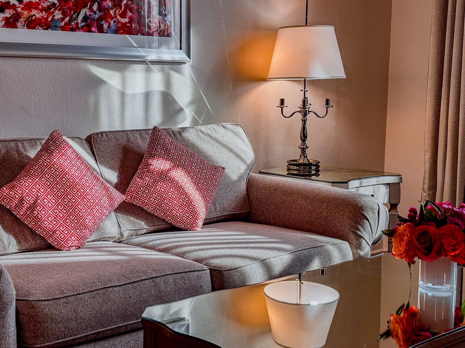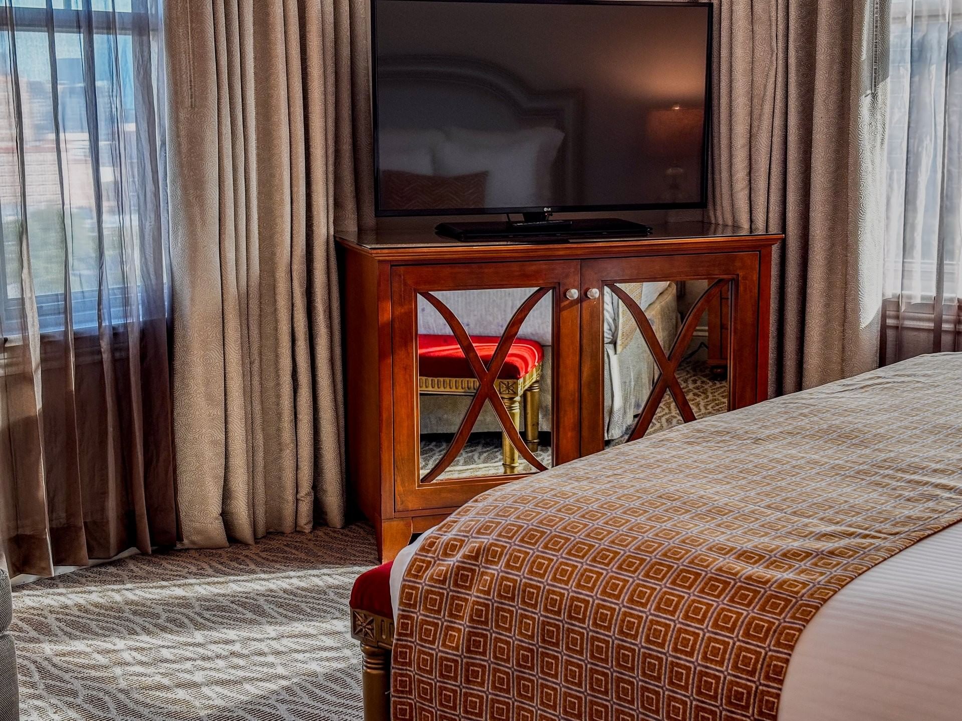 Step inside and discover a refined retreat designed for both relaxation and productivity. Spanning an expansive 800 square feet, this elegant space offers every modern comfort, from a grand crown-canopied king bed dressed in Italian Fili D’Oro duvets and 300-thread-count linens to a separate living area adorned with crystal chandeliers. A plush sofa, coffee table, dining area, additional refrigerator, and wet bar complete the experience, creating a sophisticated setting for any stay.