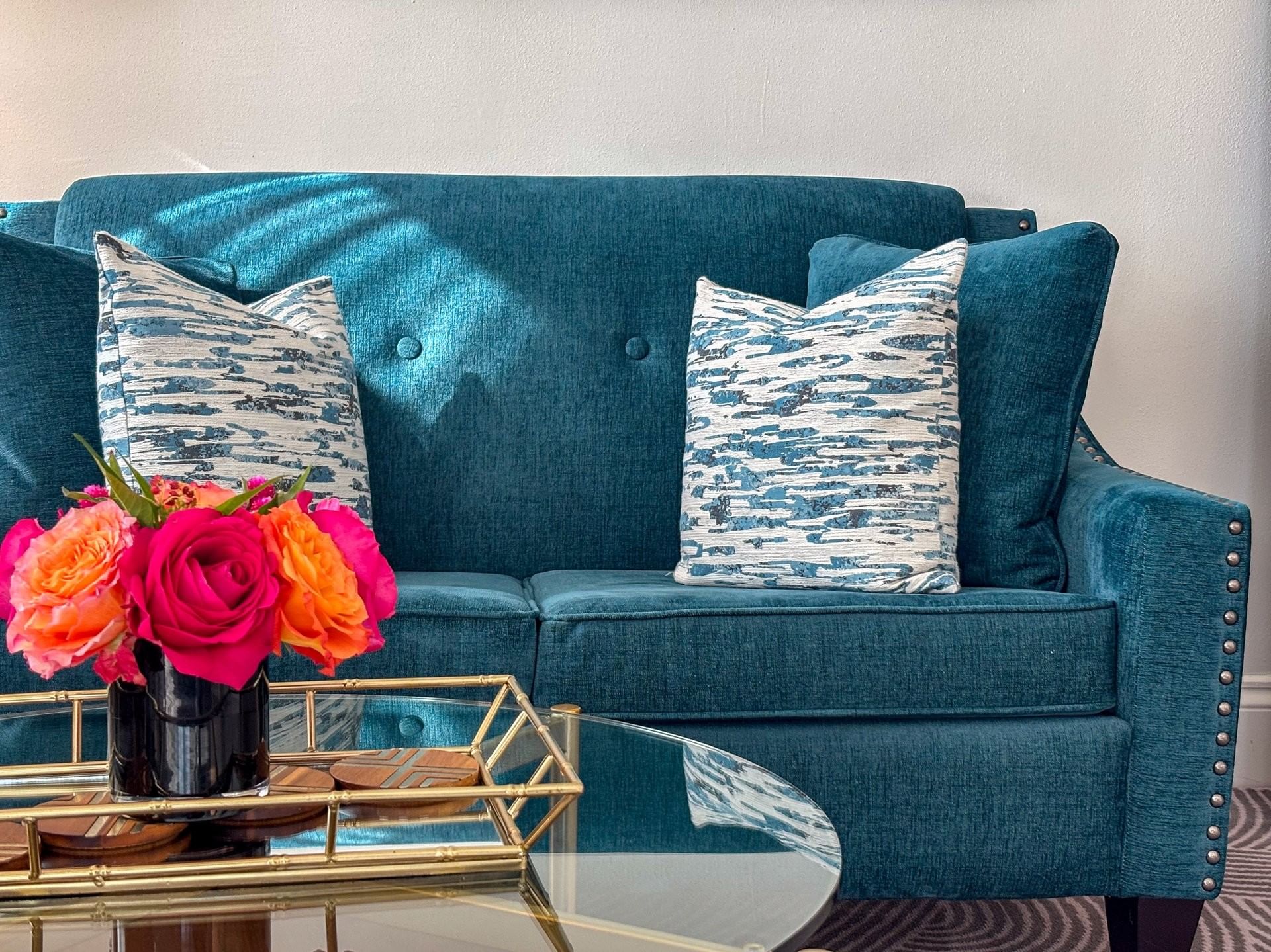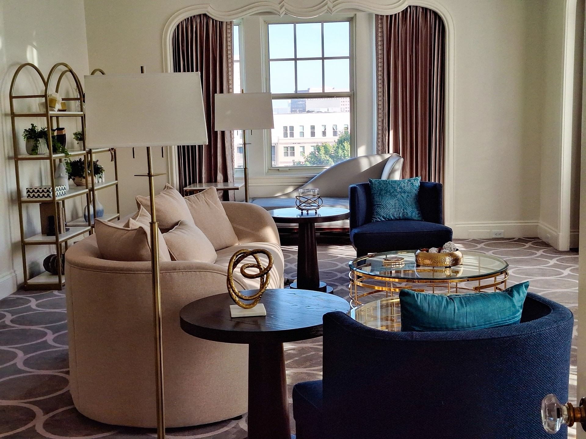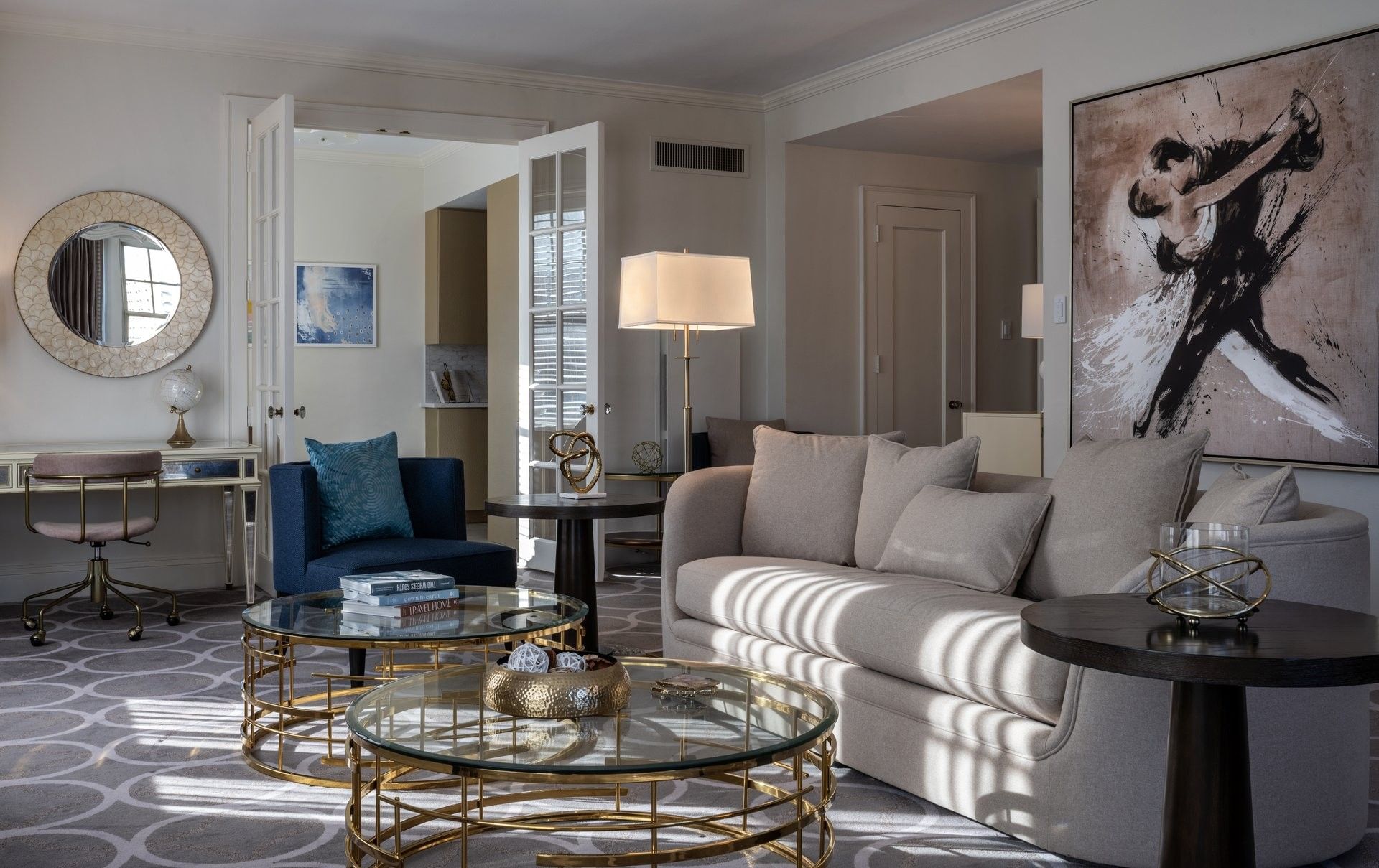 Evoking the glamour of 1920s Hollywood, the Presidential Suite offers an impressive 1,500 square feet of sophisticated living space. Designed for both comfort and entertaining, it features a fully equipped kitchen and a private dining area for eight set beneath a sparkling crystal chandelier. The separate living room includes a flat-screen television, a half bath, and elegant seating with a sofa and armchairs. In the private bedroom, a luxurious king bed awaits, alongside a spa-inspired bathroom complete with a garden tub and separate shower—creating an indulgent retreat ideal for a romantic escape or special occasion.