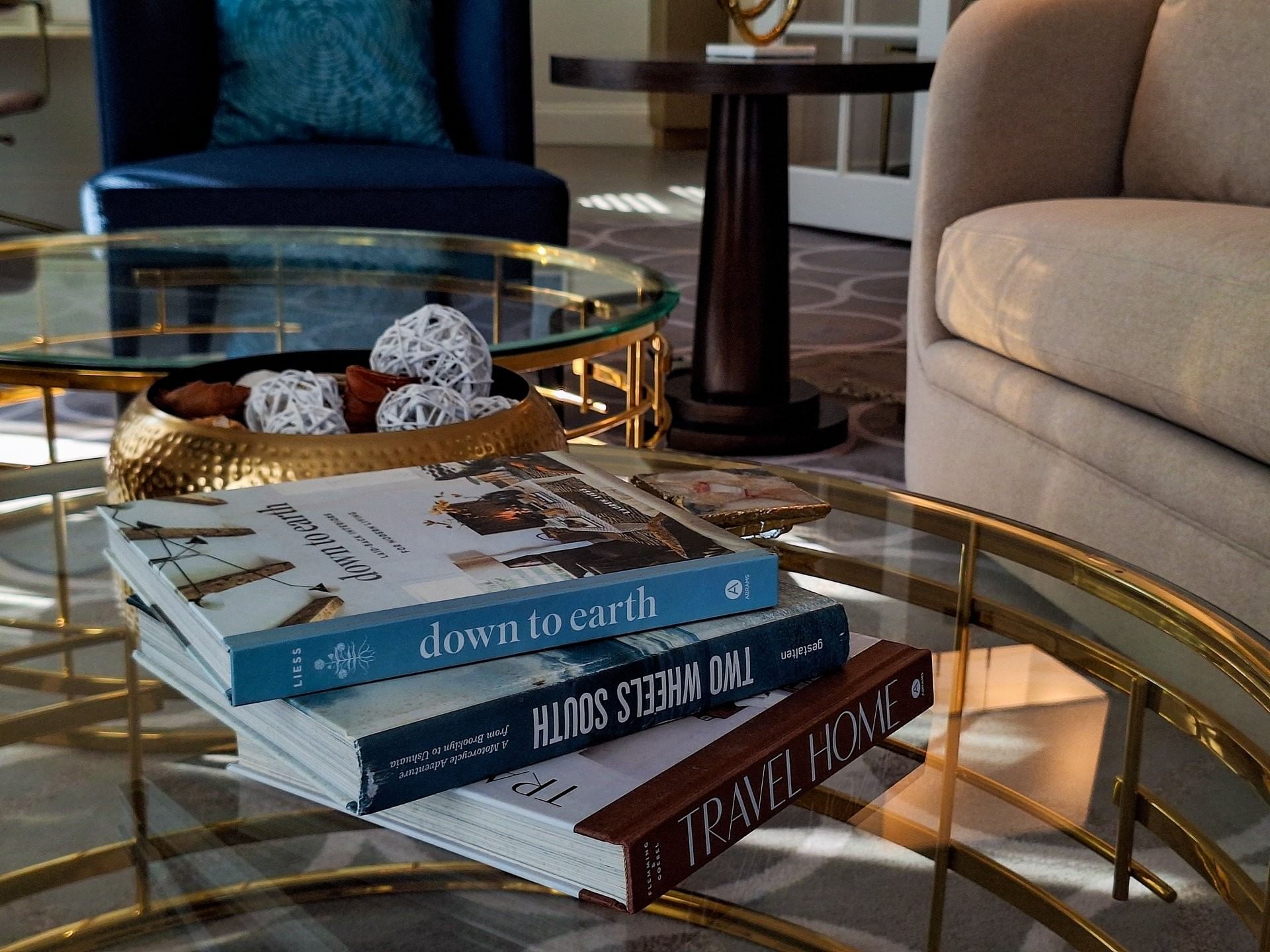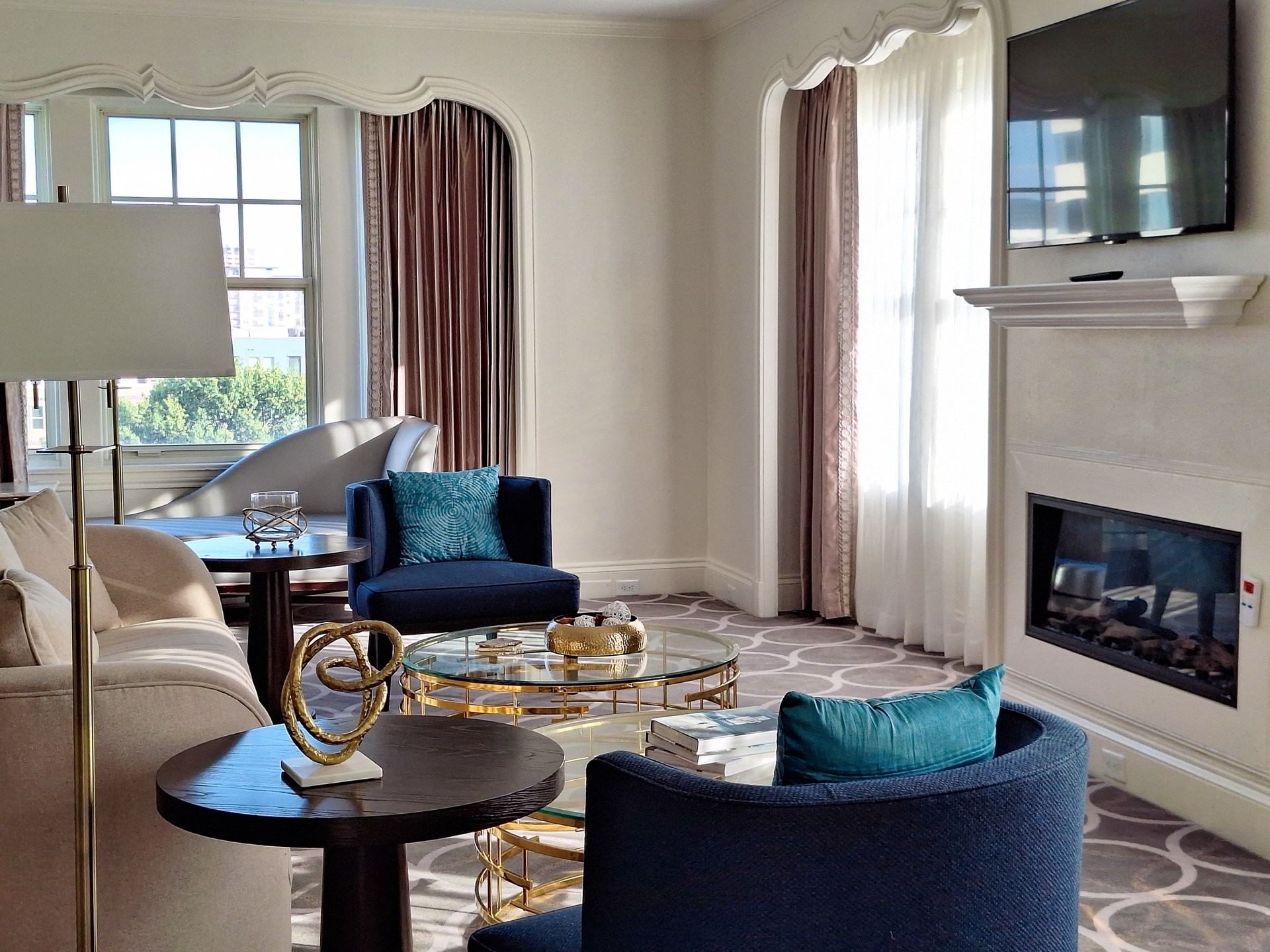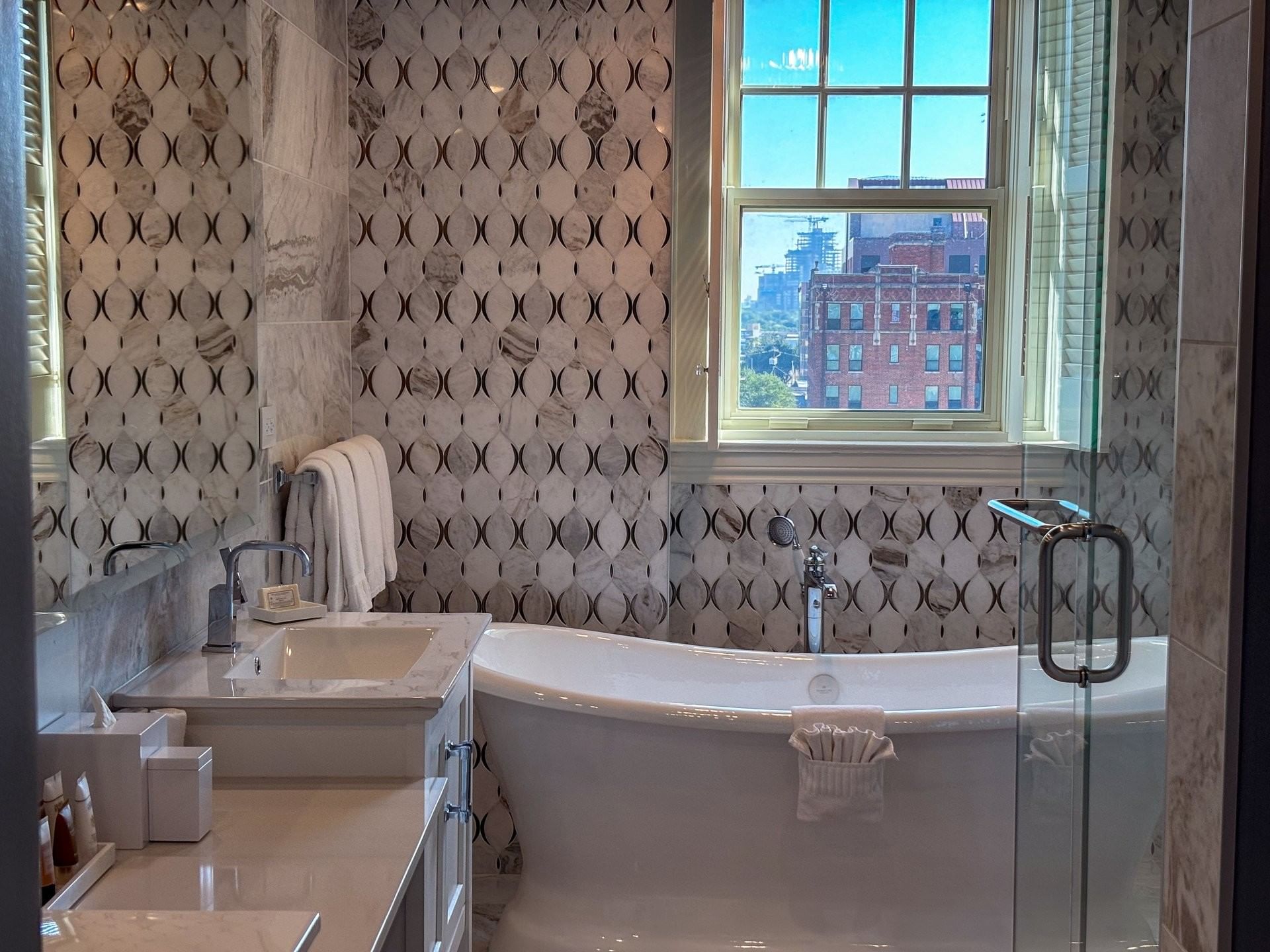 Evoking the glamour of 1920s Hollywood, the Presidential Suite offers an impressive 1,500 square feet of sophisticated living space. Designed for both comfort and entertaining, it features a fully equipped kitchen and a private dining area for eight set beneath a sparkling crystal chandelier. The separate living room includes a flat-screen television, a half bath, and elegant seating with a sofa and armchairs. In the private bedroom, a luxurious king bed awaits, alongside a spa-inspired bathroom complete with a garden tub and separate shower—creating an indulgent retreat ideal for a romantic escape or special occasion.