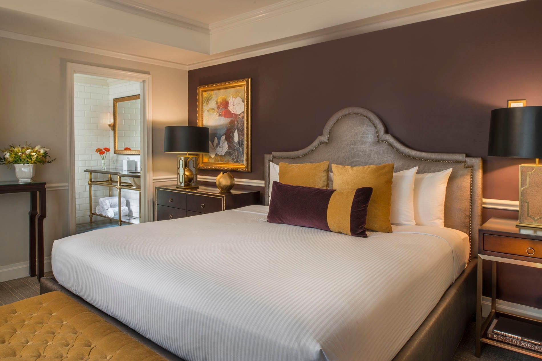 Paying homage to the Ziegfeld Follies, this 634-square-foot suite blends vintage Broadway glamour with modern luxury. Bordeaux purples, rich golds, and soft pinks complement dramatic portraits of Ziegfeld girls. The suite includes a master bedroom with a king bed and a connecting king bedroom, each with its own en-suite marble bathroom.