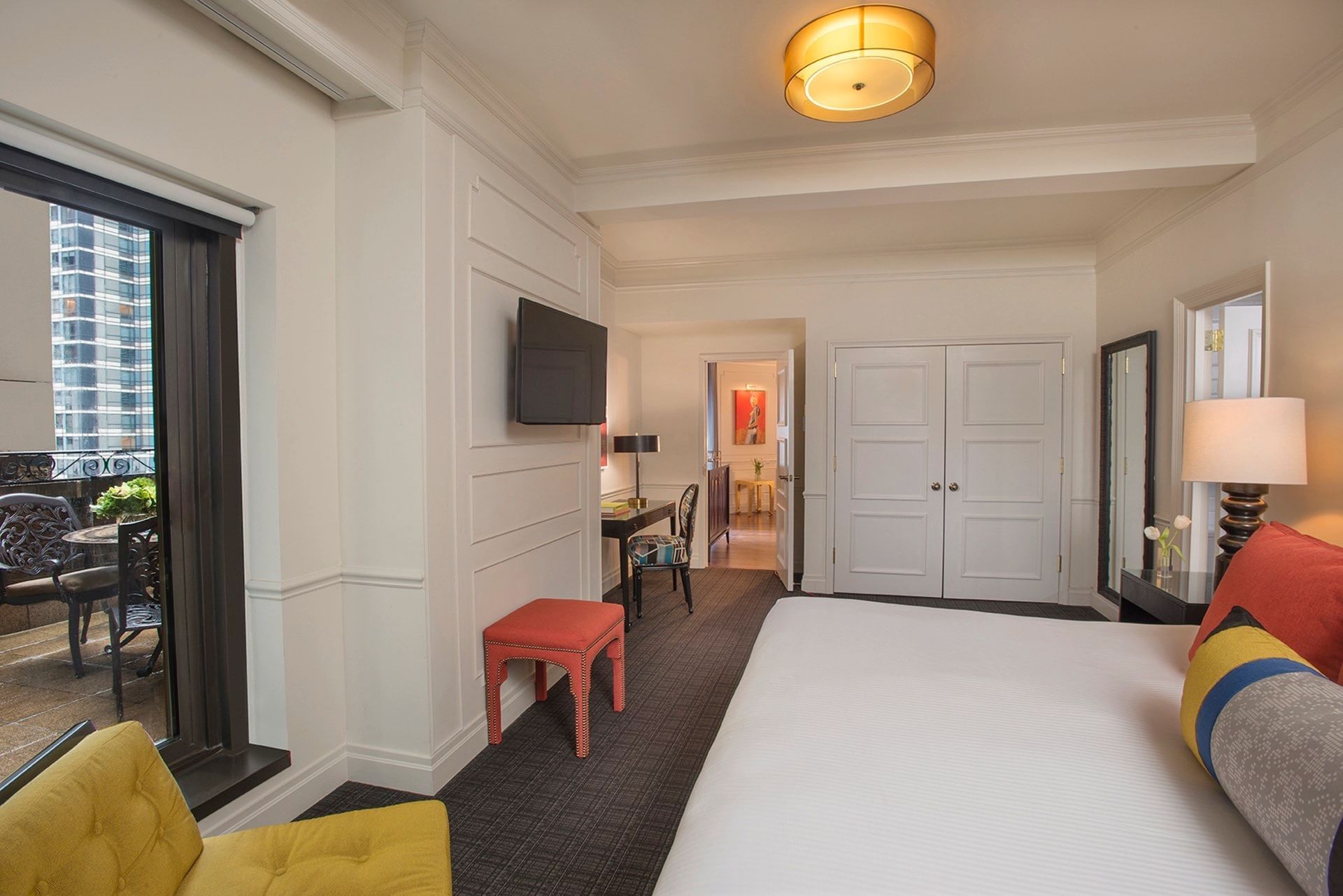 This sophisticated 285-square-foot room elevates the guest experience with a private terrace overlooking 54th Street and Avenue of the Americas.