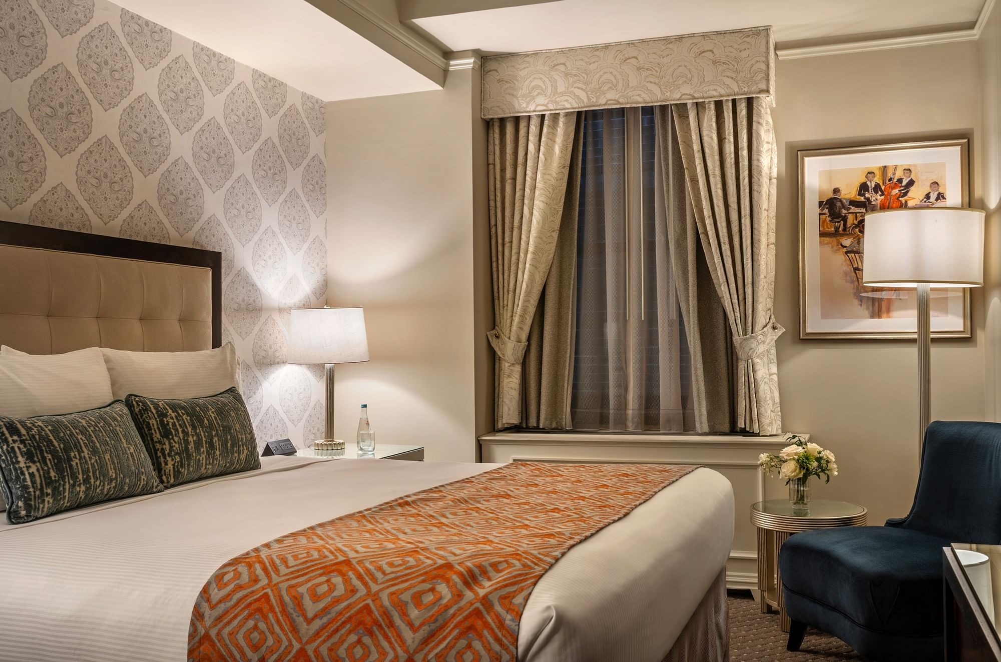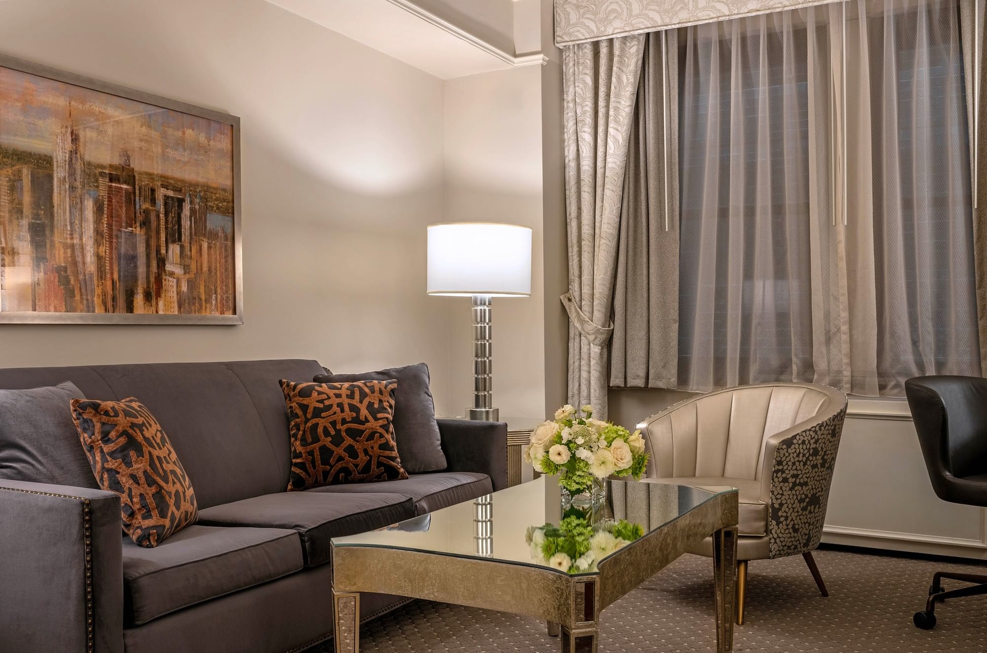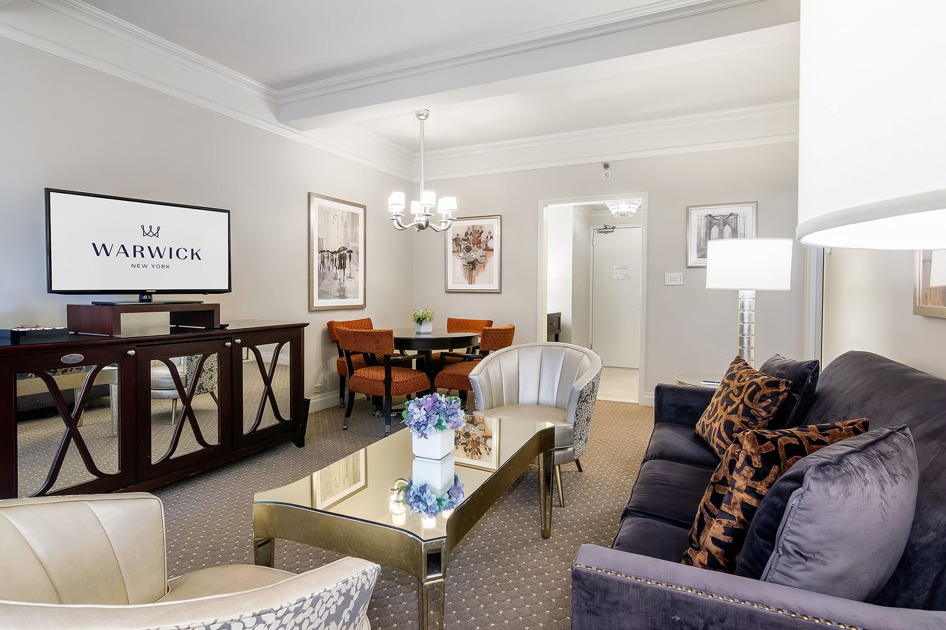 This luxurious suite boasts 650 square feet of interior space and an additional 745-square-foot wraparound terrace with panoramic views of 54th Street and the Museum of Modern Art’s rooftop garden. A decorative fireplace and lavish furnishings create a true New York oasis.